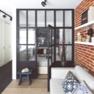 - Pour délimiter les blocs de verre de l'espace. Cela permettra non seulement d'avoir deux zones fonctionnelles dans l'appartement, mais également de préserver l'éclairage naturel. De plus, le matériau étant considéré comme durable, les concepteurs recommandent de le réutiliser lors de la rénovation de logements.