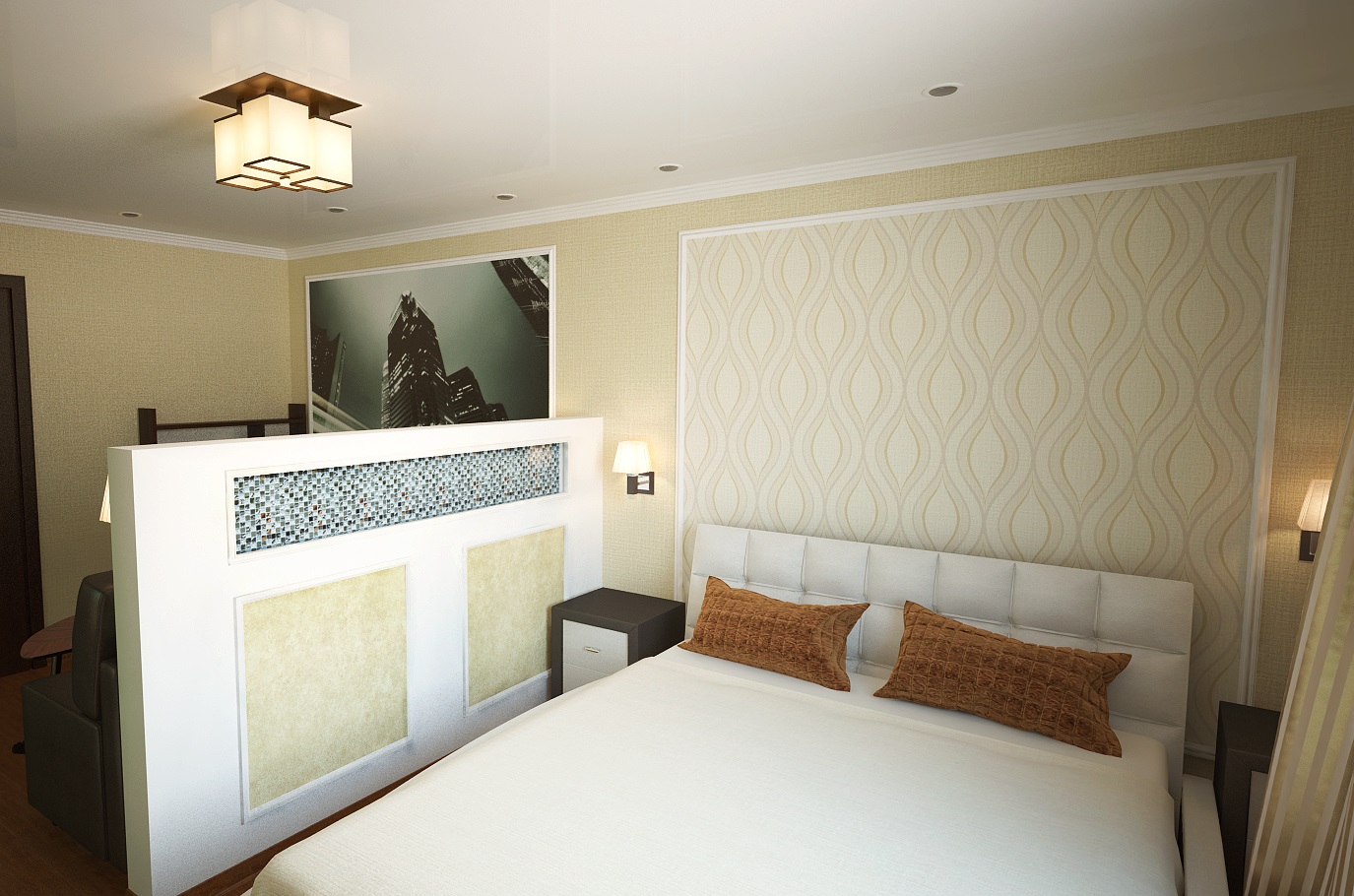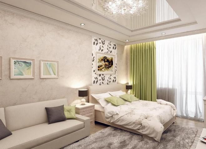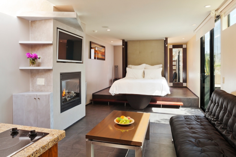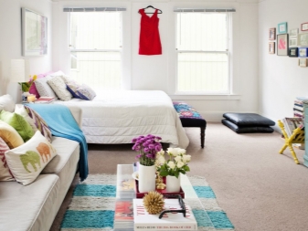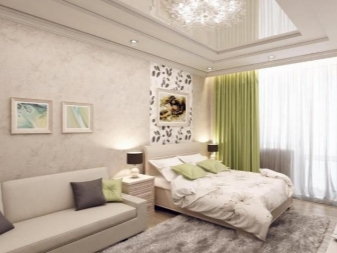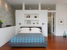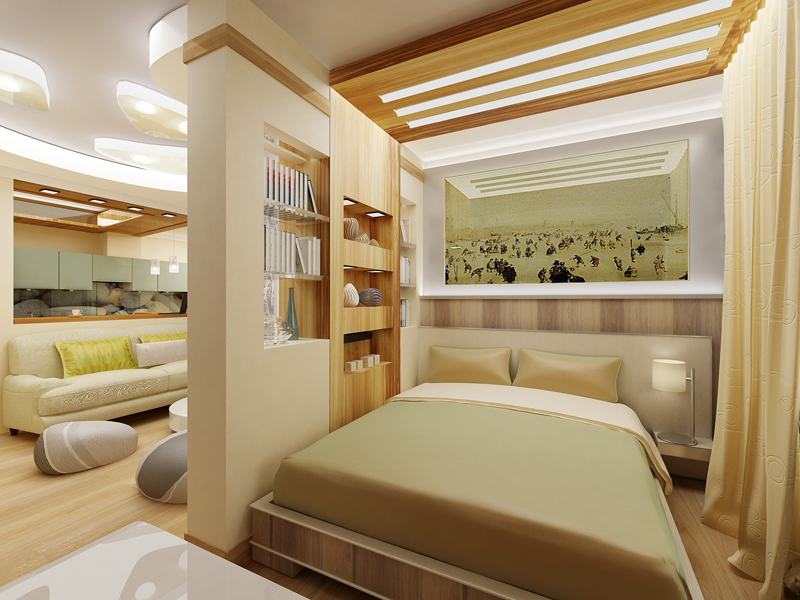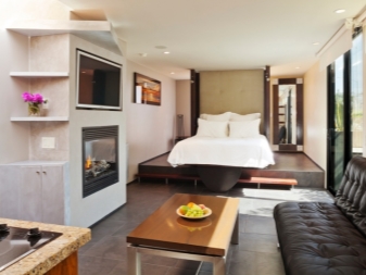 La chambre dans le studio n'est pas considérée comme une pièce séparée, c'est un endroit confortable pour dormir, éloigné par un écran ou une cloison lumineuse. Pour les lits de cette zone, vous pouvez créer un podium spécial.