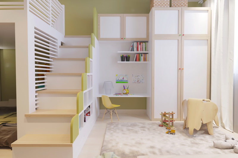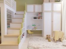 Si, dans un studio, la hauteur du plafond dépasse 2,5 mètres, une solution intéressante consiste à aménager le deuxième étage, qui convient parfaitement à la disposition de la chambre d'enfants. Dans ce cas, il est recommandé que l'échelle dans ce cas soit construite à partir des marches d'escalier, elles logeront rationnellement des livres, des jouets et d'autres objets.