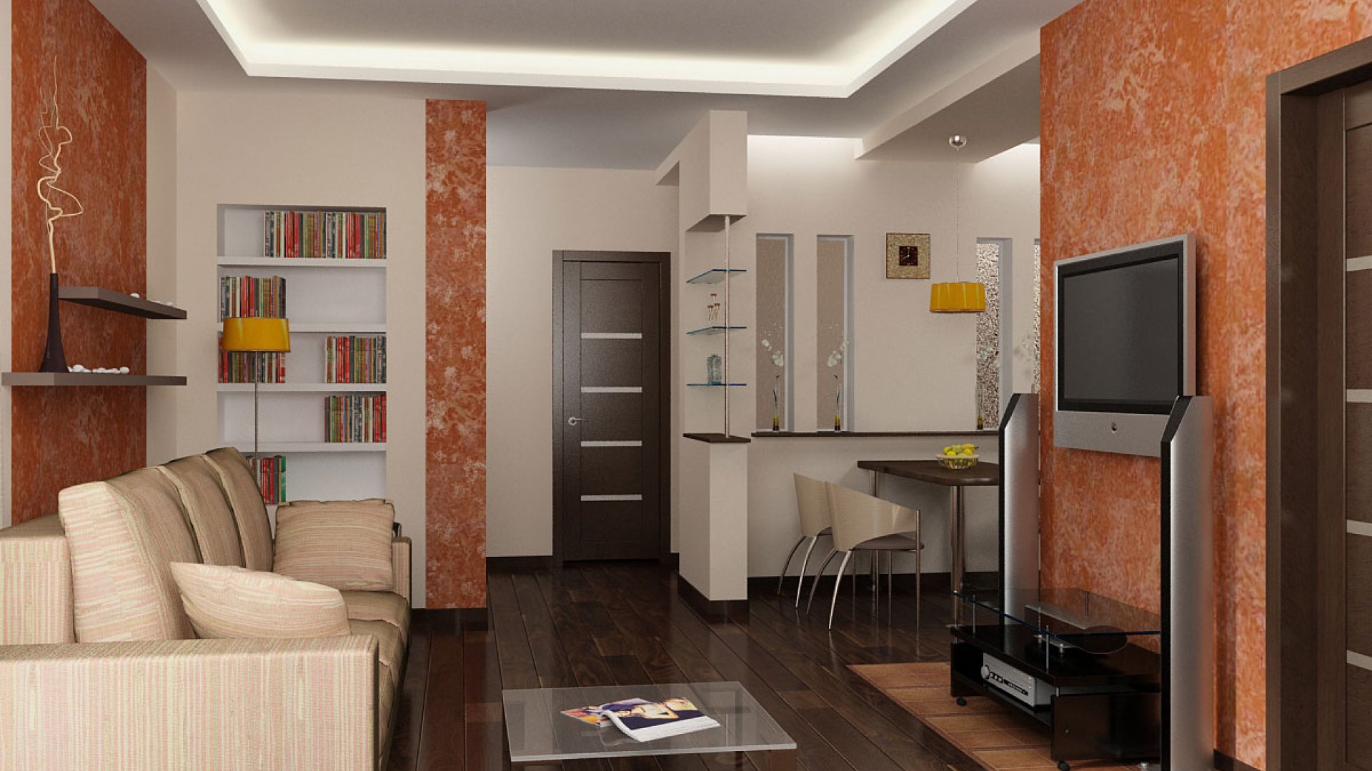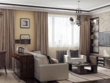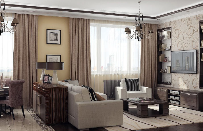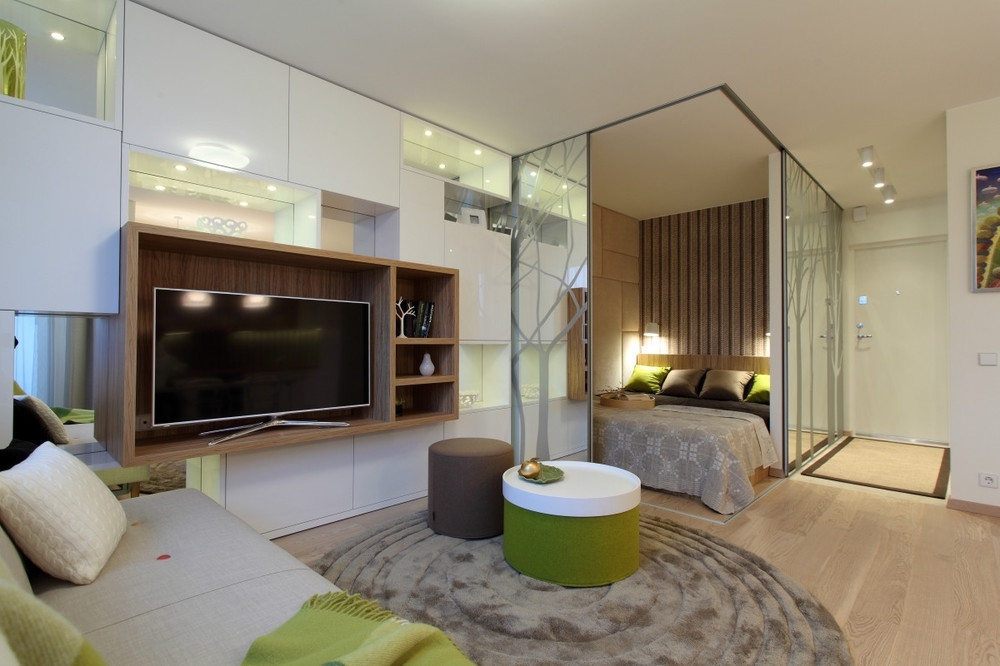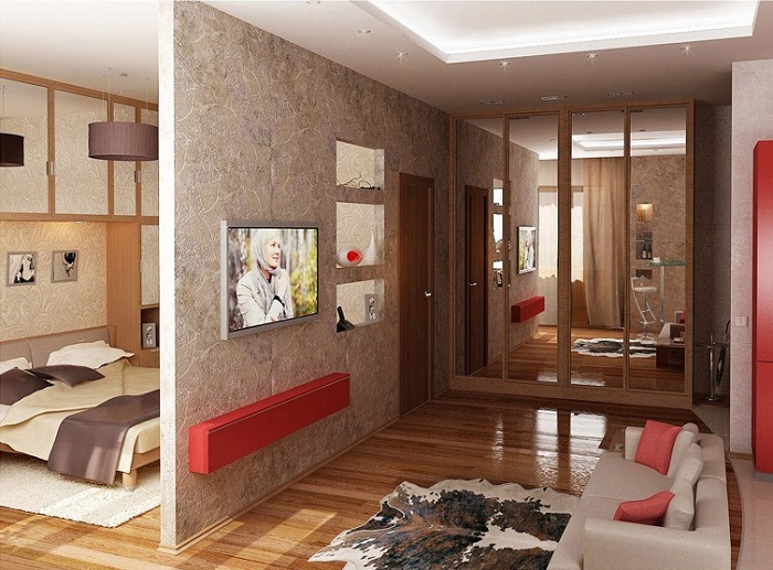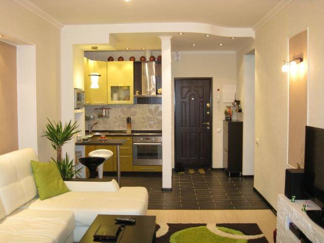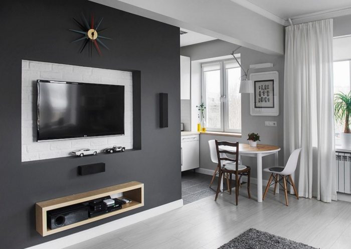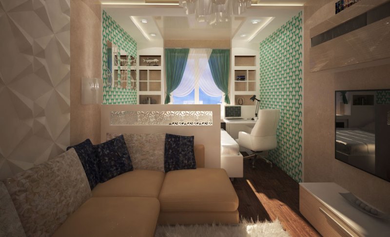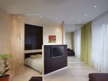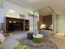Ainsi, en installant une cloison dans un appartement d'une pièce, vous obtenez un studio élégant composé d'un invité, d'une cuisine et d'une chambre. Toutes les pièces ressemblent à des carrés. Il est préférable de placer l’espace invité près de la fenêtre et de le remplir avec des éléments de base comme une armoire, une table, un canapé, un fauteuil et une télévision.