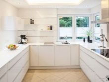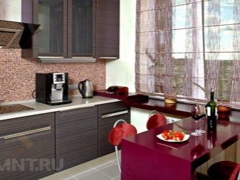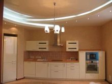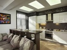 En ce qui concerne la cuisine, on utilise souvent des exemples de la conception avec la barre pour sa conception. Il convient de noter que cette conception convient aux appartements d'une superficie d'au moins 40 mètres carrés. Si la pièce ne dispose pas de suffisamment d'espace pour l'installer, vous pouvez simplement installer le plafond suspendu avec éclairage et disposer les appareils, les armoires pour la vaisselle et la cuisinière.