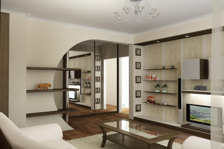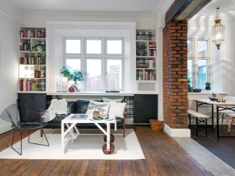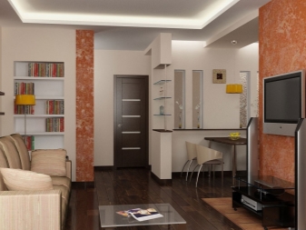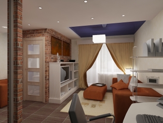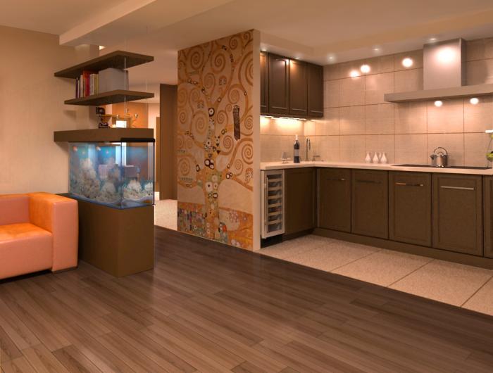 Récemment, les studios sont devenus extrêmement populaires, ils représentent un type de logement moderne, dans lequel les cloisons entre les pièces sont réalisées à l'aide de rayonnages, d'étagères et d'écrans lumineux. Un muret de plaques de plâtre divise non seulement la pièce à l’origine, mais la rend également confortable. En même temps, le coin salon et le coin cuisine sont bien séparés par une arche décorative. Ce réaménagement devrait également comprendre un sol de zonage: Les carreaux de céramique peuvent être posés dans la cuisine et le stratifié ou le parquet dans le salon.