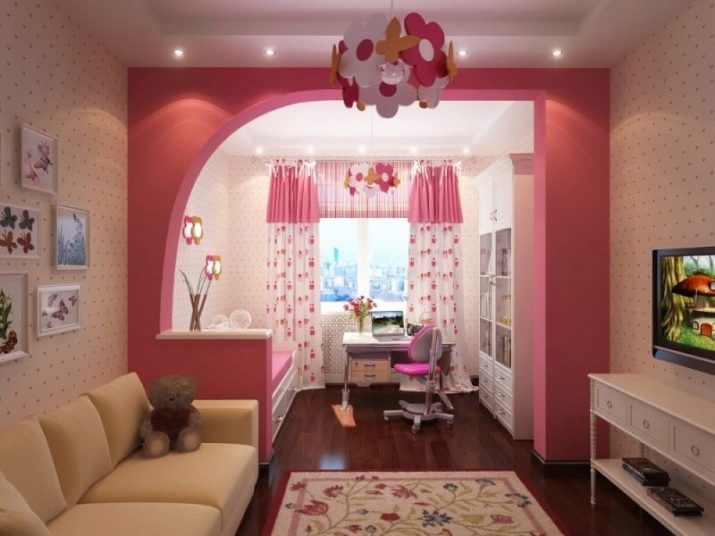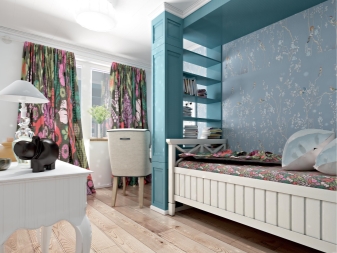 Pas mal dans ces regards de logement et zonage visuel, décoré en utilisant différents types de papier peint et de rideaux. Les deux parties de la pièce seront séparées par une échelle de couleurs. Le plus souvent, une idée aussi intéressante est choisie pour les familles dans lesquelles vivent des enfants de sexes différents. C'est Tout d'abord, une pièce séparée est créée, puis le redéveloppement du concepteur est effectué à l'intérieur.