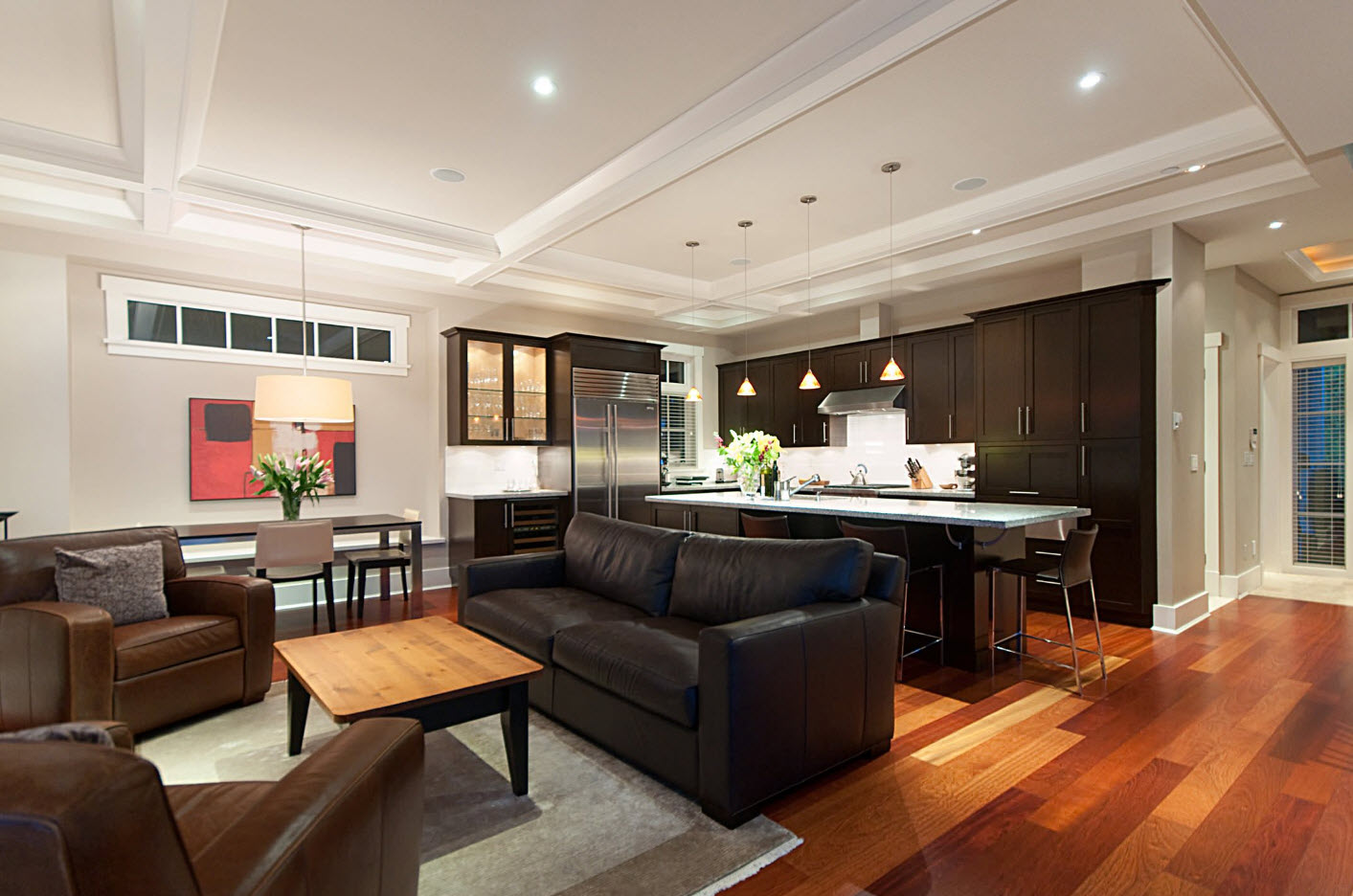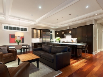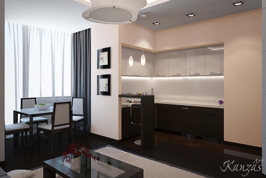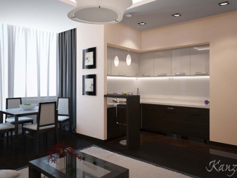 Il est recommandé de souligner également les bordures de toutes les zones de la pièce avec différentes couleurs dans le revêtement de sol, le plafond et la décoration murale texturée. Une telle différence de niveaux permettra de distinguer clairement la cuisine de l'étude de l'espace de vie.