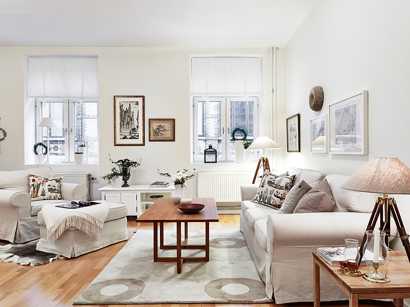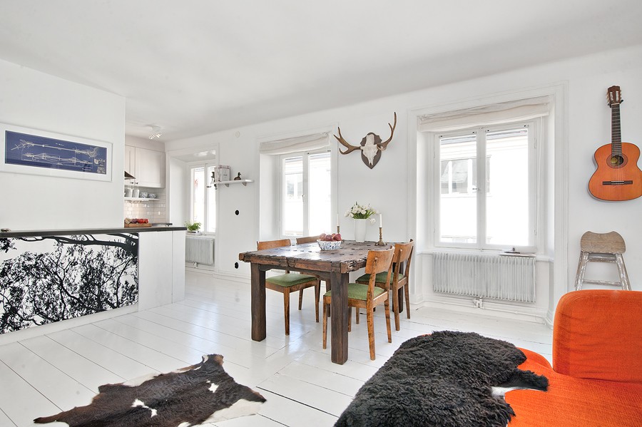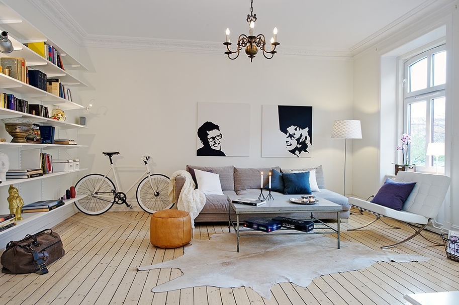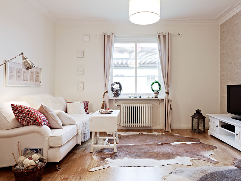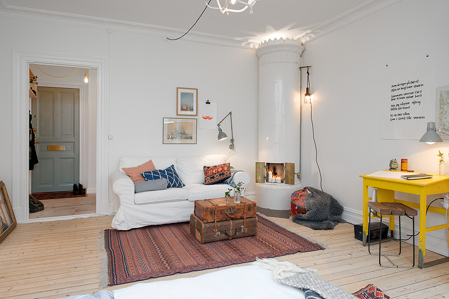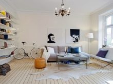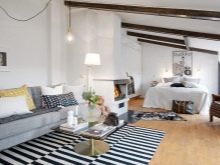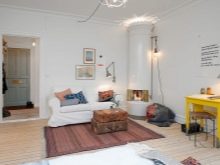 Le sol permet une grande variété. Ceci est particulièrement important pour les studios, car cela aide à zoner la pièce. Le bois ou le stratifié de couleurs naturelles le plus utilisé: pin, bouleau, hêtre. Les Scandinaves aiment beaucoup les planches blanchies et pas beaucoup - les arbres à reflets rougeâtres. Pour conserver les sols blancs plus longtemps, vous pouvez les recouvrir d'une peau ou d'une fourrure (même artificielle) à poils longs. Les tapis tricotés seront très beaux.