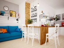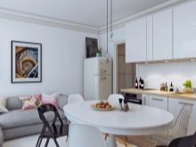 - un canapé et un lit, une table et des chaises - tout doit être simple, confortable, compact et ergonomique; si possible, il est préférable d’acheter des chaises pliantes et une table; au lieu d’armoires fermées, utilisez des étagères suspendues et des supports pour vêtements;
