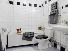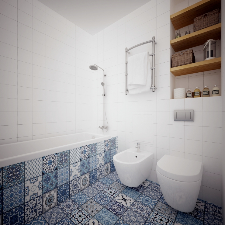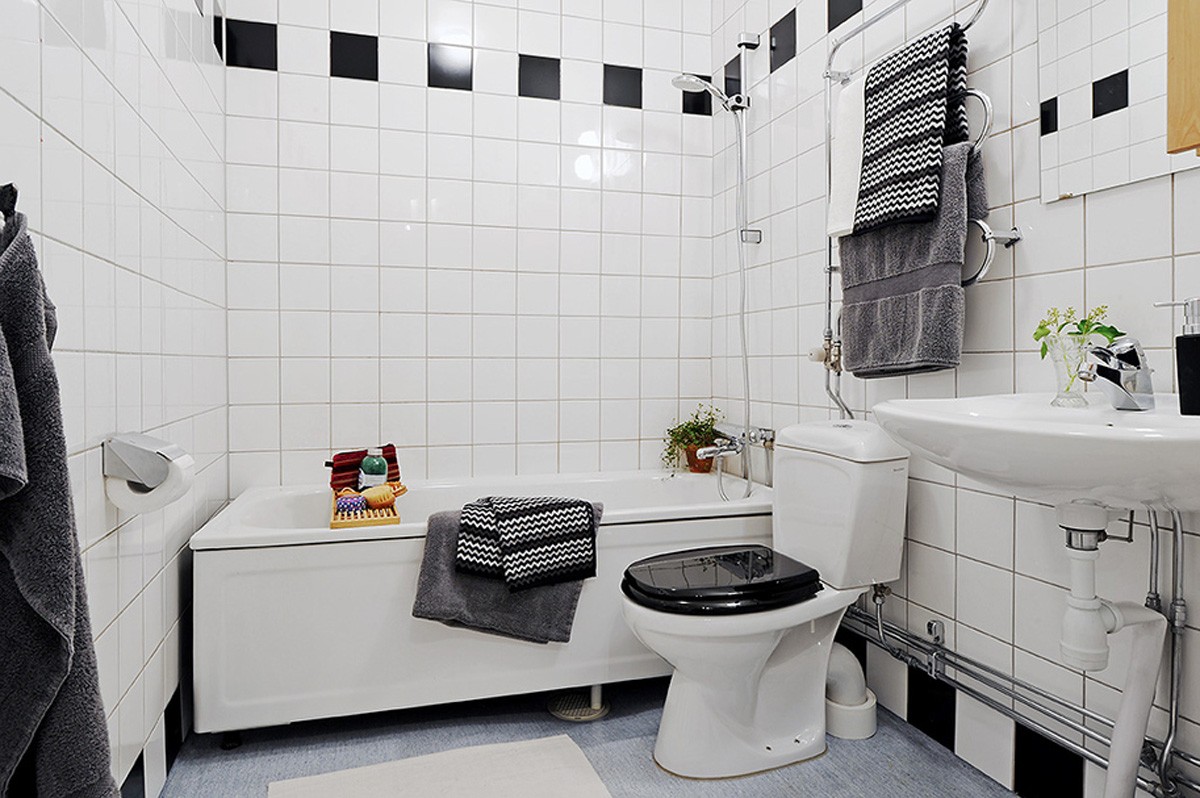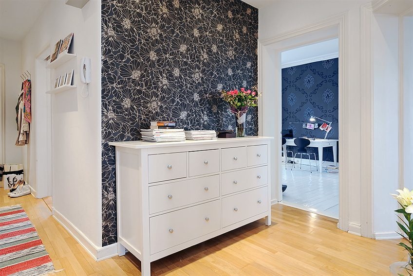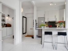 Pour la cuisine et le couloir souvent choisir des carreaux. Et s’il s’agit ici de couleurs laconiques ou de contrastes noir et blanc, le sol est souvent recouvert de carrelage bleu et bleu dans la salle de bain avec un motif scandinave stylisé.