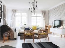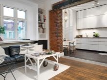 Les meilleurs projets de conception démontrent diverses combinaisons de matériaux. Cela vous permet de délimiter l'espace d'un petit appartement sans installer de partitions supplémentaires. Un revêtement de sol différent vous permet de séparer la cuisine du salon.L'utilisation de papier peint sur un fragment de mur en plâtre ajoutera du confort à la chambre à coucher. Le mur de briques rouges deviendra un accent de couleur dans la salle blanche et vous rappellera le lien entre le style scandinave et le loft.