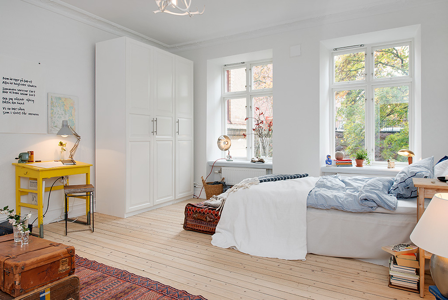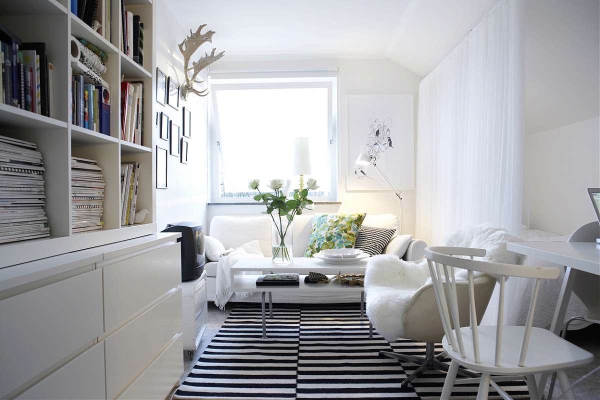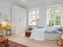 Pour les très petites chambres, le style scandinave est salut, car il est basé sur l'ergonomie de l'espace. Le manque de beauté stéréotypée et l'utilisation d'objets fonctionnels permettront d'économiser sur le manque de mètres carrés.
