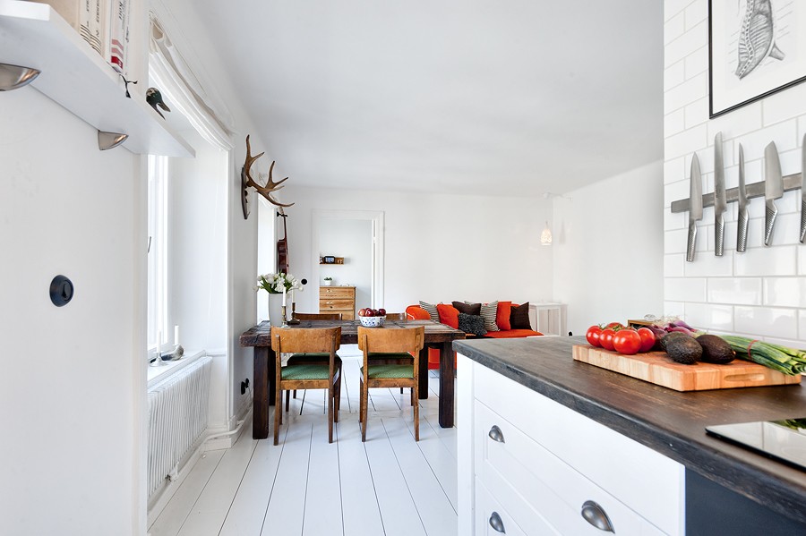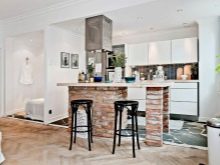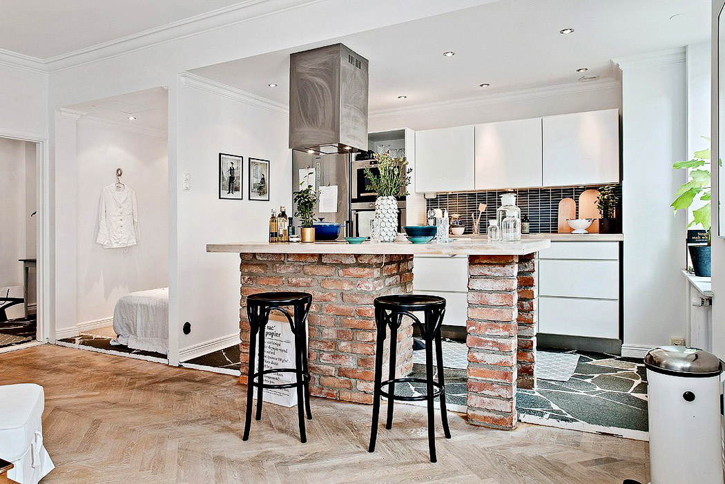 Une autre option - carrelage dans la cuisine et la salle de bain. Ici, les Scandinaves utilisent comme d'habitude les carreaux blancs sans fioritures et avec des dessins vifs et texturés. Les briques rouges non finies sont fréquentes dans de tels appartements. Il peut s’agir d’un mur porteur extérieur ou d’une cloison spécialement conçue dans le studio. Mais le plus souvent, la brique est blanchie avec de la peinture acrylique (émulsion aqueuse).