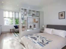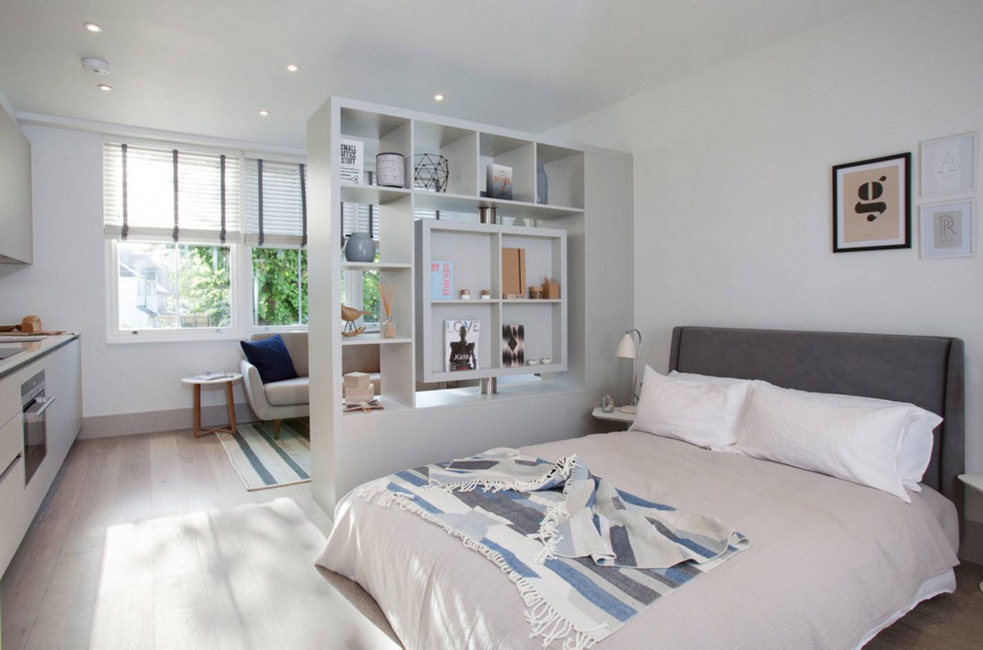 - Le zonage à l'aide d'étagères ouvertes aidera à organiser l'espace de travail et de couchage dans un appartement d'une pièce.