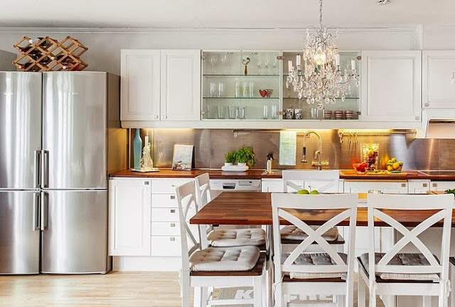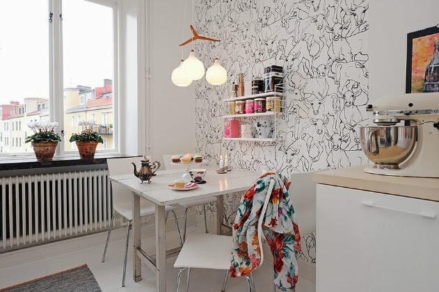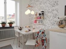- Un papier peint inhabituel aidera à attirer l'attention d'un enfant méchant et à protéger le mur des éclaboussures indésirables.La cuisine attire l'attention sur le manque de rideaux et de stores. C'est un phénomène fréquent dans le style scandinave, mais il est peu probable qu'il convienne aux habitants des premiers étages.