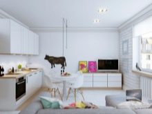 L'appartement, décoré dans un style proche du minimalisme, aurait semblé ennuyeux et inconfortable. Les éléments décoratifs seront des accents lumineux pouvant décorer la vie des propriétaires de la maison.