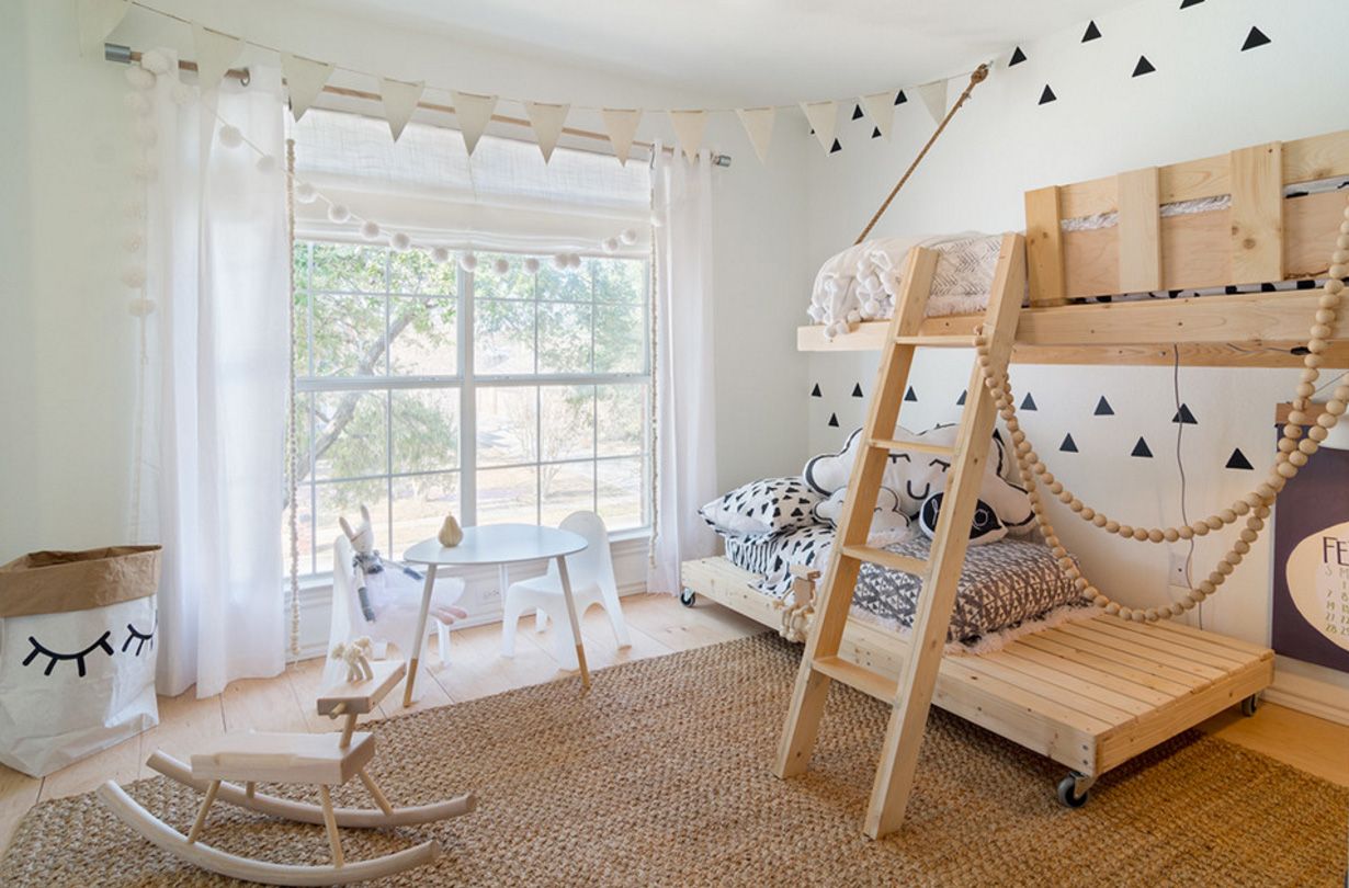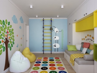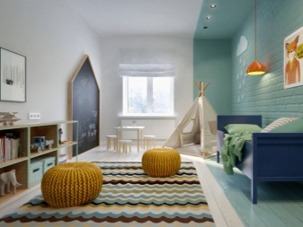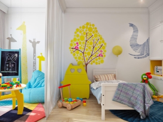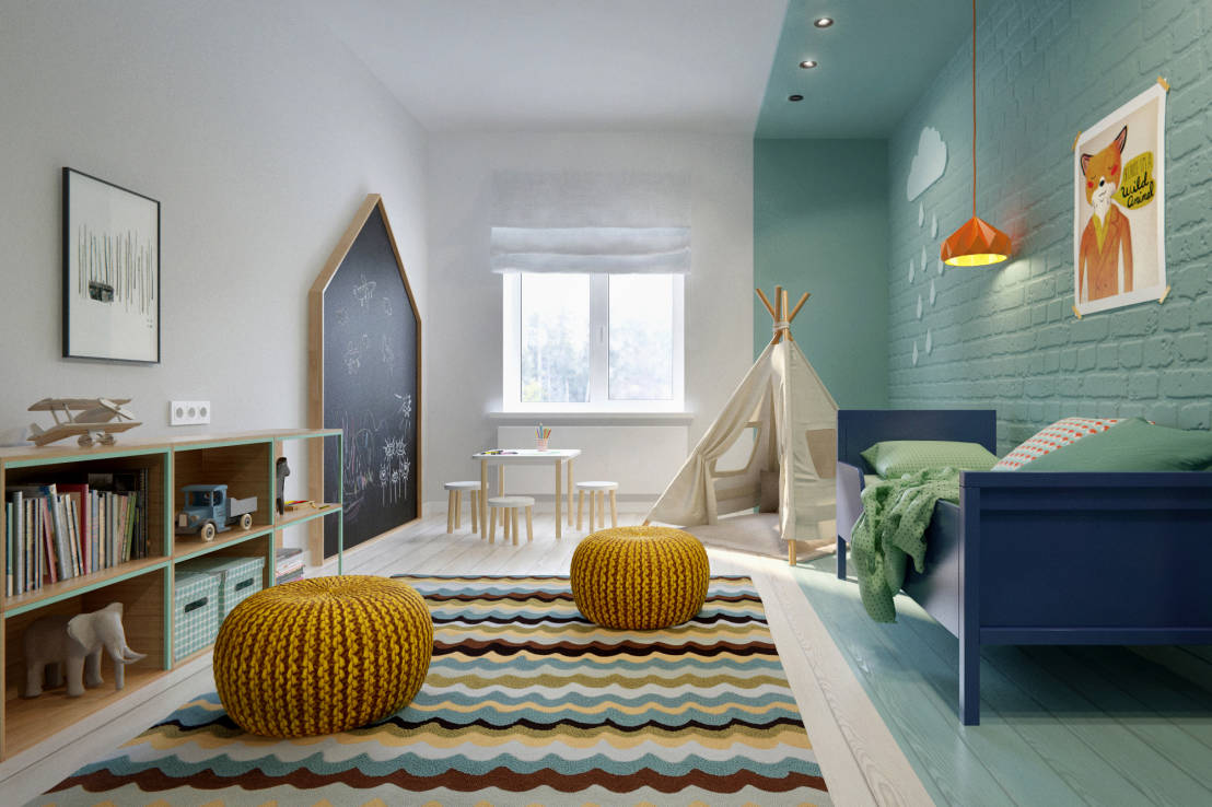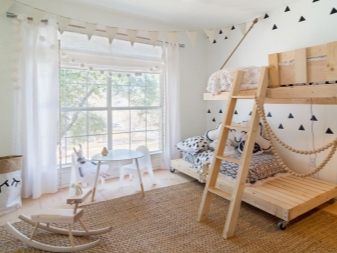 Un appartement d'une chambre permettra aux enfants d'attribuer une pièce séparée. Il est important de rappeler que pour l'organisation de la pépinière, d'autres facteurs doivent être pris en compte: sécurité, disponibilité d'un lieu de travail et d'un lieu de jeux, confort psycho-émotionnel en raison de la sélection correcte des couleurs et des meubles. Les meubles superposés permettront d'économiser de l'espace pour le divertissement. La présence d'un grand nombre de tiroirs et de paniers inhérents au style scandinave convient parfaitement aux jouets pour enfants.