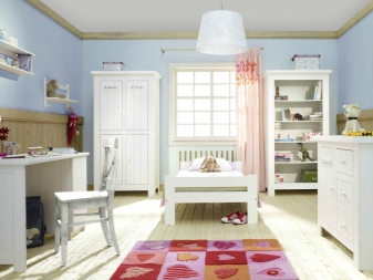 Une attention particulière doit être portée au sol de la pépinière. Cela n'a aucun sens de poser un parquet coûteux., à cause de farces enfantines, il pourrait bientôt gonfler ou se déformer. Et en même temps, le sol doit être chaud. Peut-être que le râteau peint en bois est la meilleure option. Mais n'oubliez pas les tapis et les carpettes sur une base épaisse.