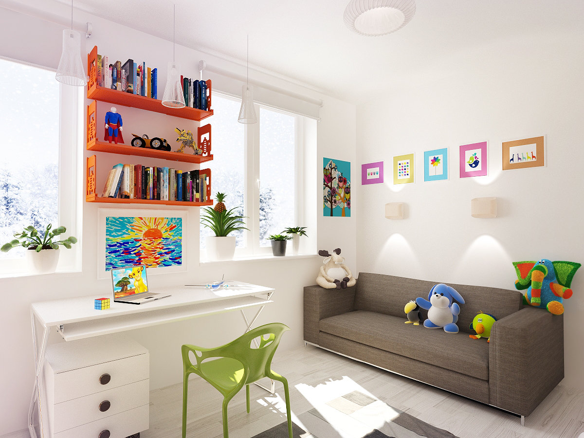 Mais de nombreux designers modernes adhèrent à l'idée que le blanc est terne et peut conduire à la dépression. Donc offre un design lumineux, saturé, capable, à leur avis, donner de la vitalité aux habitants de ces pièces. Cela est particulièrement vrai des chambres d'enfants.