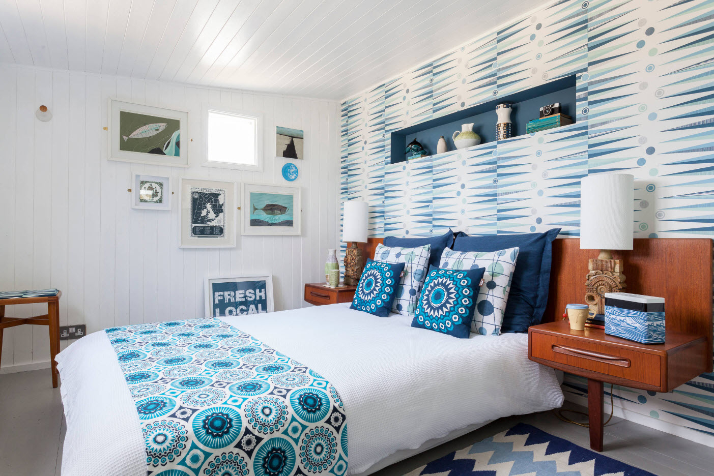 En plus du blanc, les Scandinaves adorent utiliser du bleu ou du bleu à l'intérieur. La proximité de la mer rend cette couleur naturelle non seulement dans la salle de bain, mais aussi dans la chambre à coucher. Dans le même temps, vous trouvez rarement des motifs sur le thème marin. Il y a plutôt des modèles nationaux stylisés.