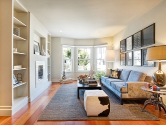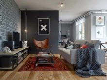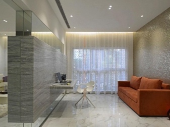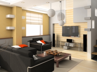 L'aménagement de l'intérieur peut varier en fonction du type de pièce. Si ce studio est situé, il est important de le diviser correctement en zones fonctionnelles. Et pour le zonage, il est préférable d'utiliser des planchers, des plafonds à plusieurs niveaux, des textures changeantes et des ombres de murs. Dans ce cas, essayez d'exclure les partitions solides.