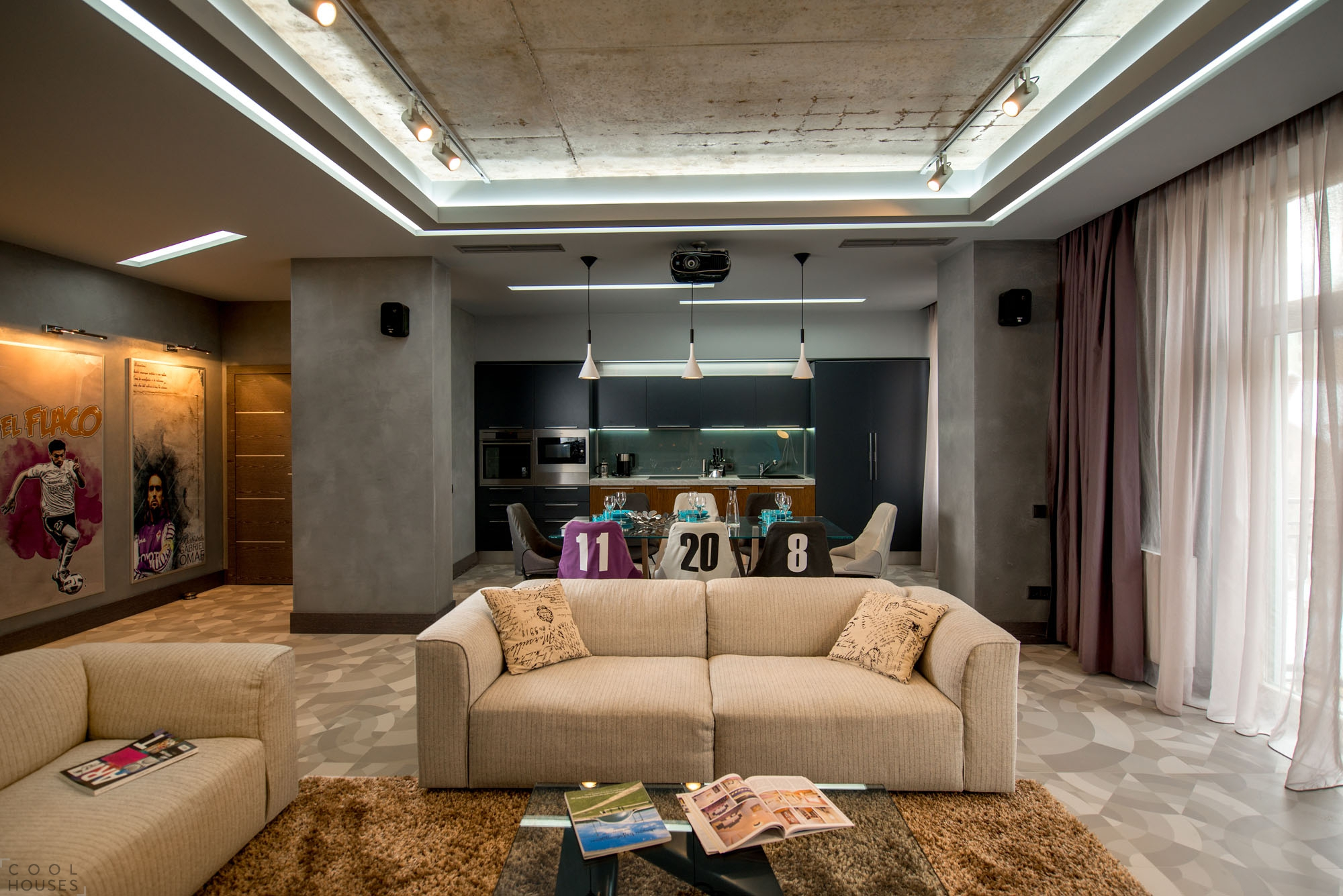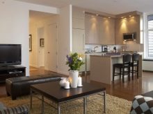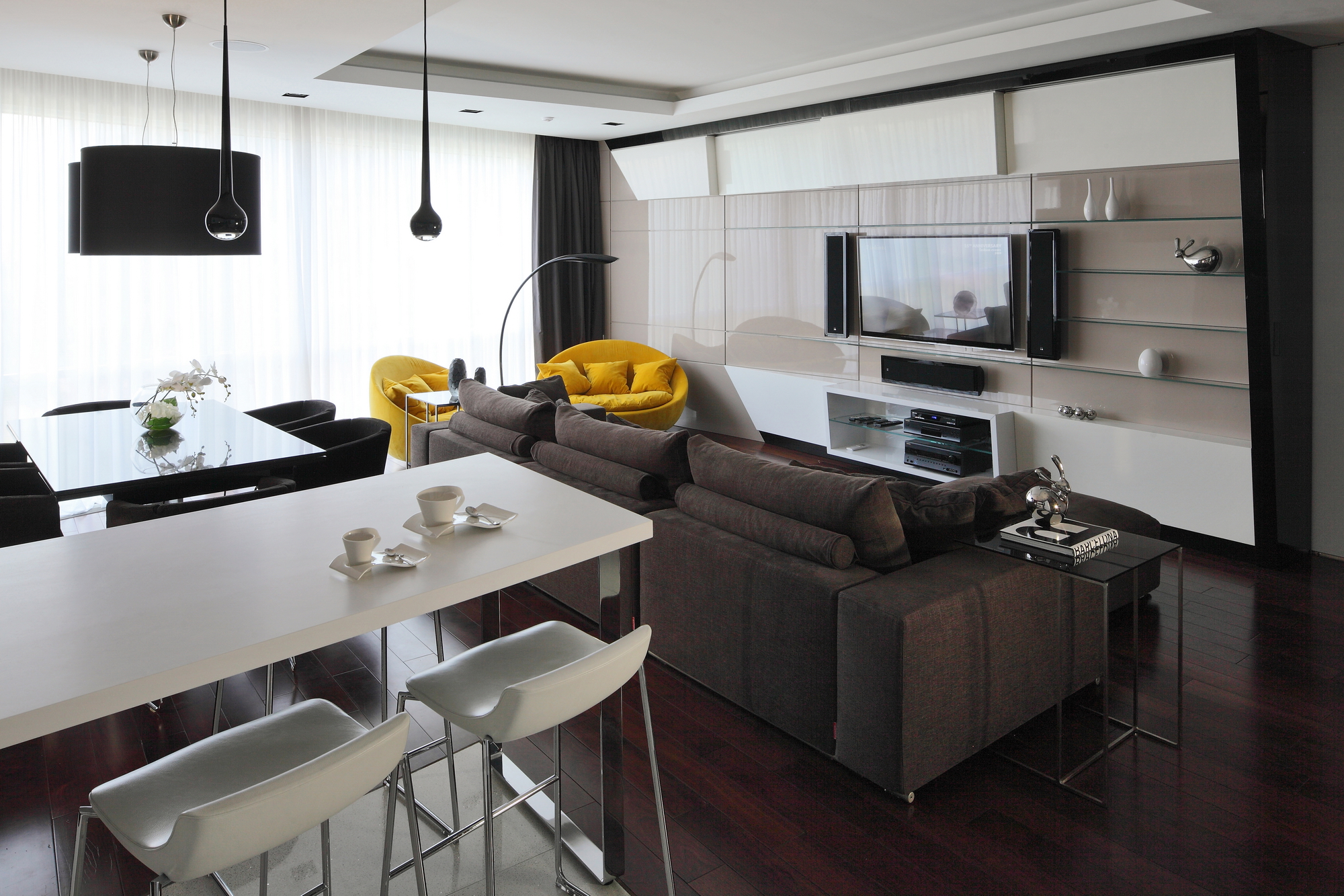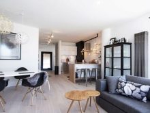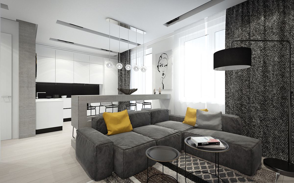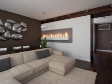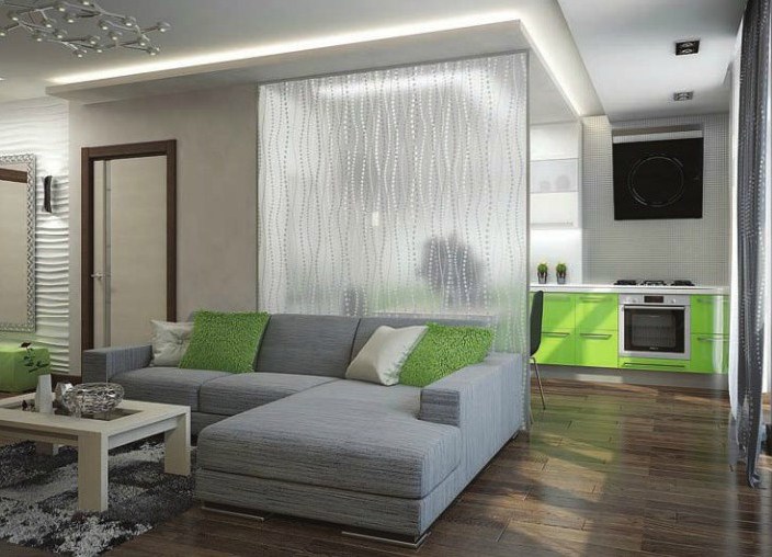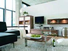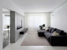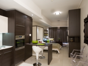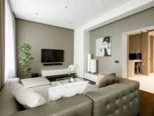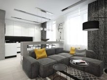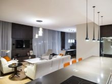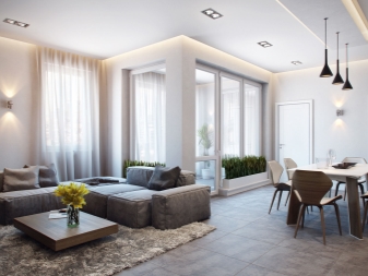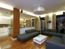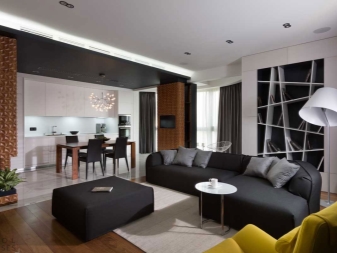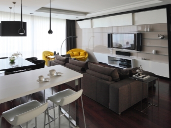 Maintenant à la mode sont des appartements par type de studio. Ils assument la présence d'un seul espace et la division en zones fonctionnelles. Dans ce cas, le regroupement de meubles est une excellente option. Dans de tels appartements, l'intérieur est le plus souvent conçu dans un style moderne.