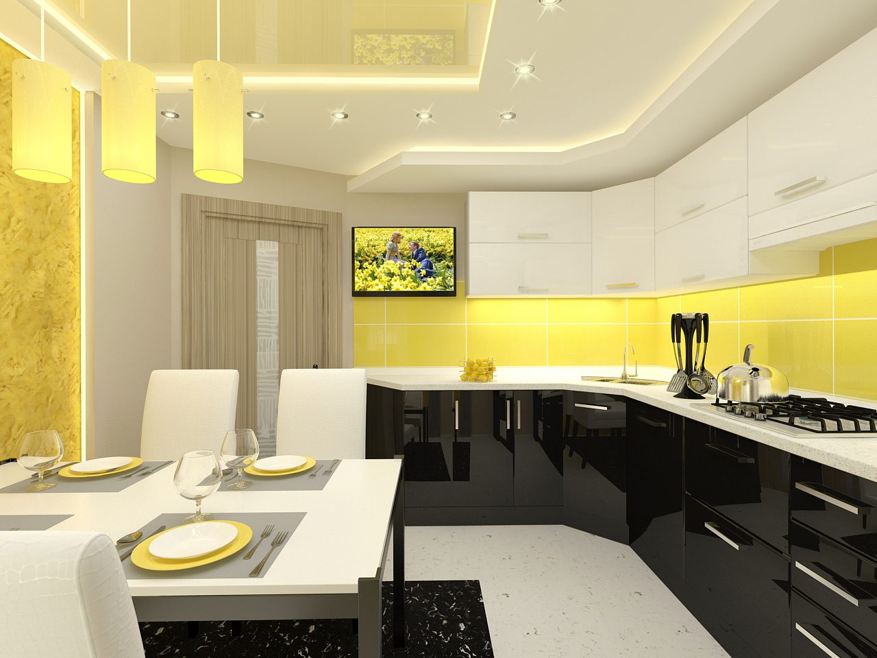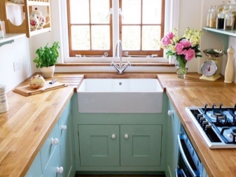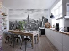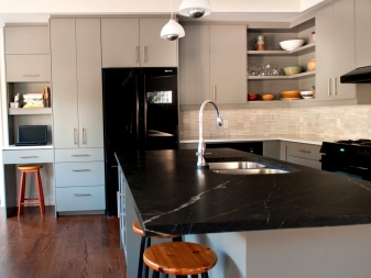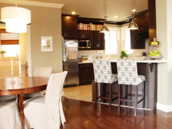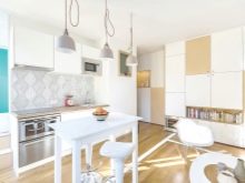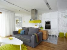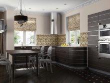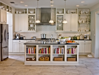 Cette cuisine est le plus souvent divisée en plusieurs zones fonctionnelles: la zone de travail de l’hôtesse avec un ensemble de cuisine et un tablier, où se trouvent de nombreux appareils électroménagers, et un coin repas. Une autre variante implique une petite cuisine, où il y aura seulement une salle à manger et un espace de travail de l'hôtesse, puis la salle à manger sera sortie dans le salon.
