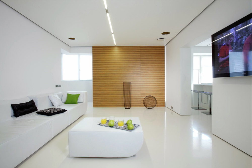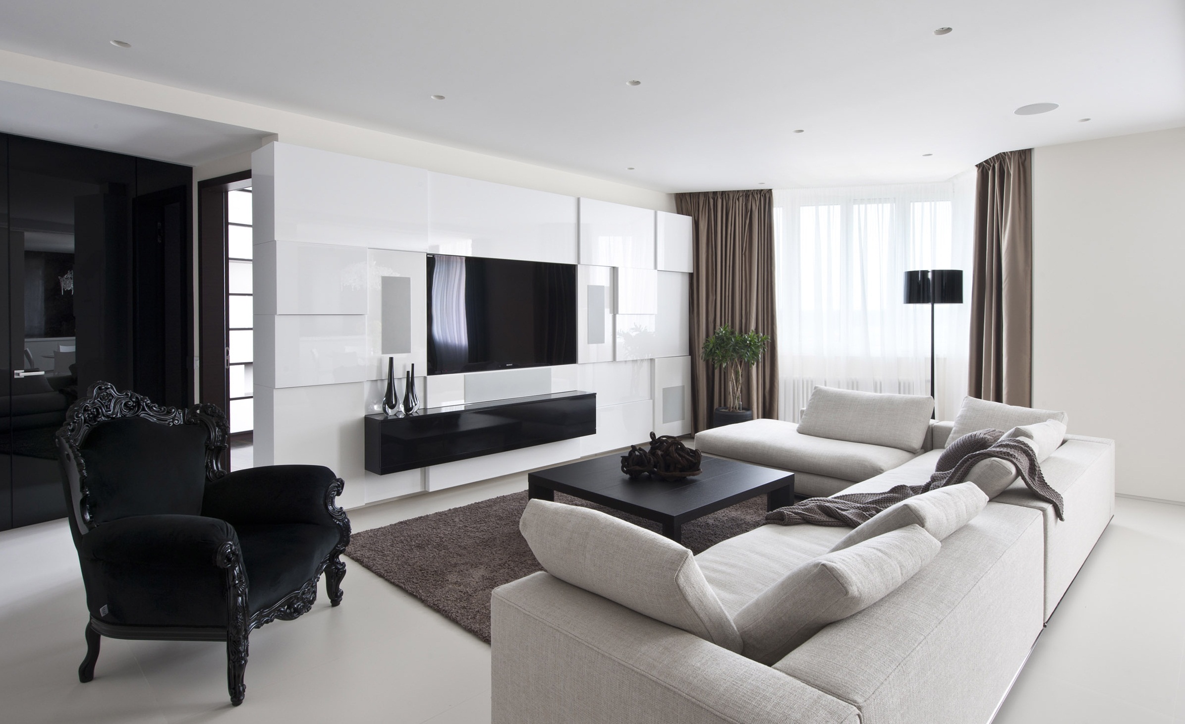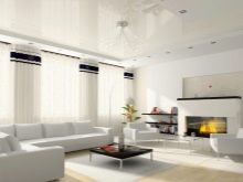 Lorsque vous terminez des intérieurs modernes, vous pouvez utiliser deux couleurs supplémentaires qui pourraient diluer l'intérieur blanc. L'essentiel - choisir deux sons de ce type qui seront combinés l'un avec l'autre. Vous pouvez diluer l'intérieur blanc avec une nuance de bois, ainsi que des textures grises. Vous pouvez préférer les tons contrastés plus foncés, par exemple le brun foncé ou le noir. Ainsi, vous pouvez organiser presque n'importe quel but de la pièce.