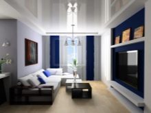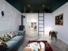 Mais si vous avez une petite hauteur de pièce, les panneaux décoratifs aux couleurs vives sont parfaits. Dans ce cas, le plafond doit visuellement soulever la pièce et l’agrandir. Par conséquent, la solution idéale serait un plafond suspendu brillant.
