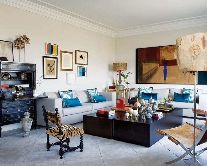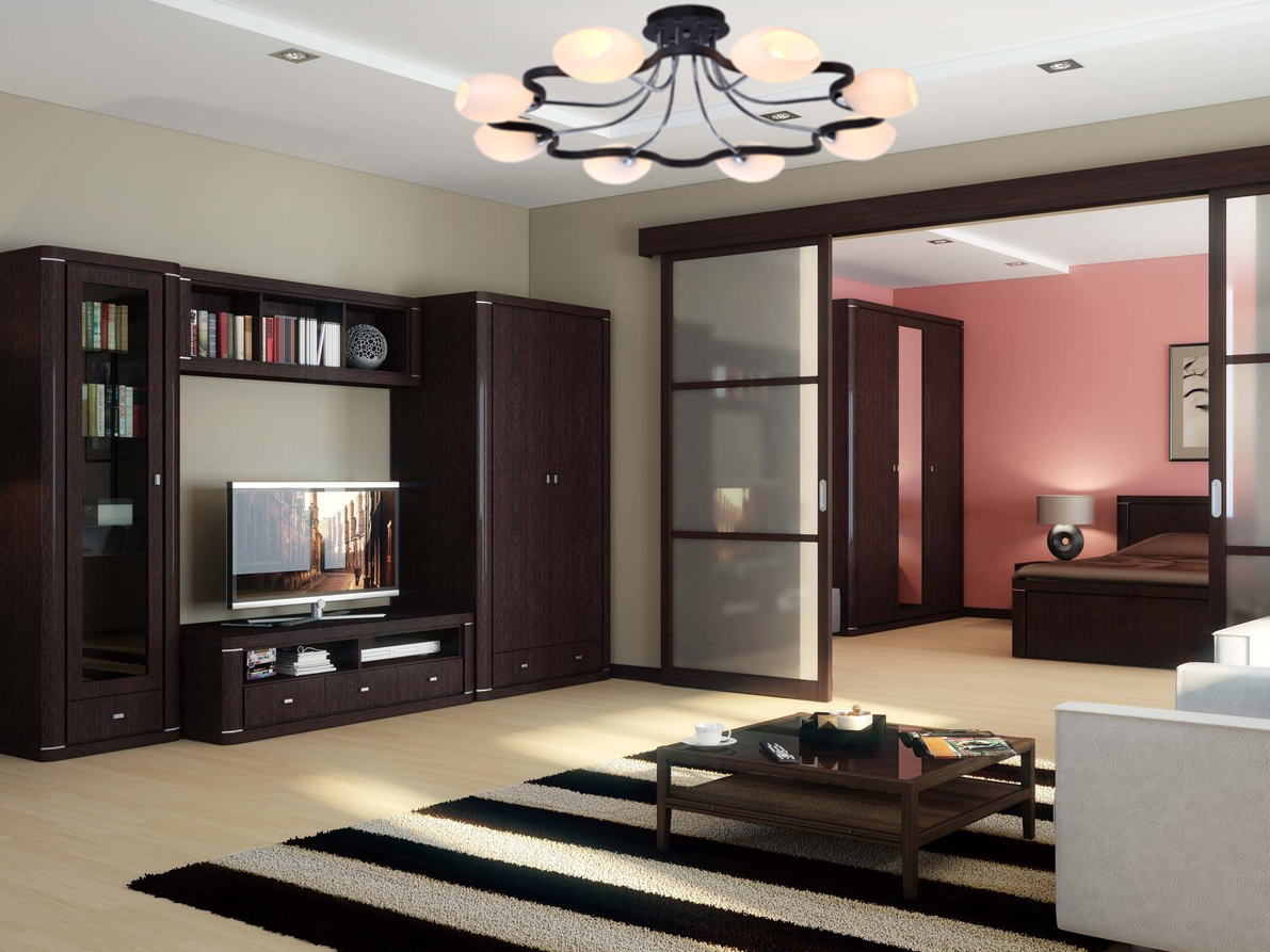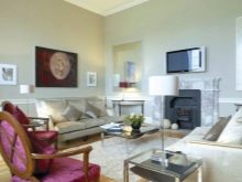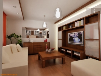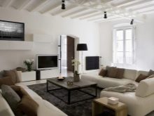 Les meubles ne doivent en aucun cas être placés sur le périmètre des murs, en laissant des empreintes d’au moins 50 cm, ce qui vous permet de remplir la pièce avec compétence, en la plaçant dans des îles séparées.