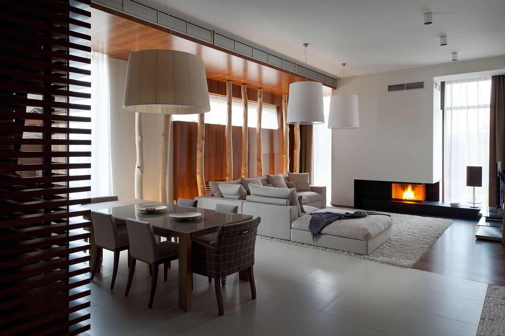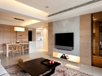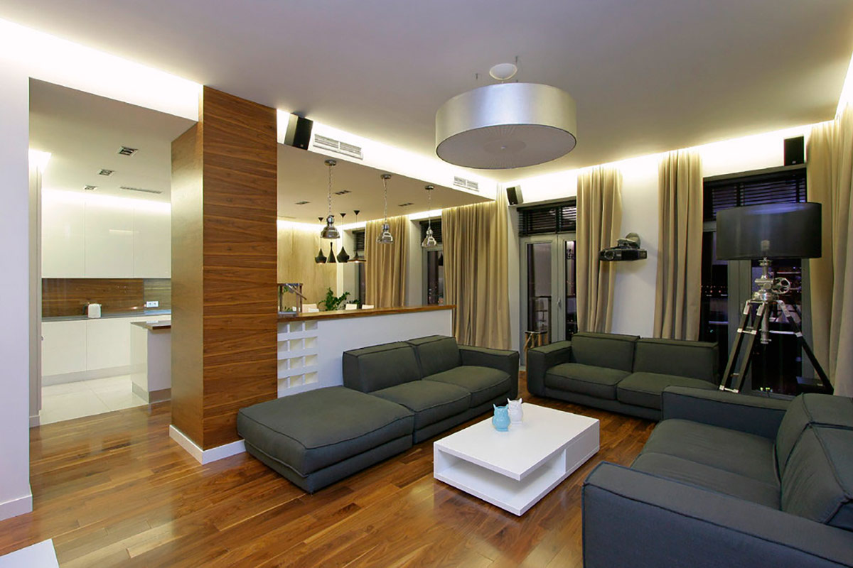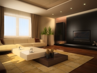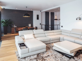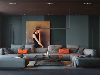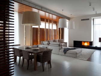 Les détails ne devraient pas être tellement, mais ils devraient être clairement visibles. Les idées de planification sont telles que les meubles sont disposés en groupes séparés, ce qui permet souvent de diviser l’espace en zones. En outre, dans tous les intérieurs modernes, il existe de nombreuses manipulations inhabituelles rétro-éclairées, consistant à diviser la pièce avec des projecteurs, des appliques murales et des lampadaires dans une pièce spacieuse en zones fonctionnelles.