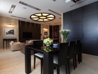 À cet égard, la salle à manger est transférée dans le salon afin que vous puissiez y installer une table et des tabourets plus grands. En ce qui concerne la cuisine, il existe deux options de planification. Si la pièce est spacieuse, elle peut inclure une salle à manger séparée et un coin cuisine. Les tables peuvent être rondes et concises. Les articles en verre sont également très populaires dans les cuisines modernes.