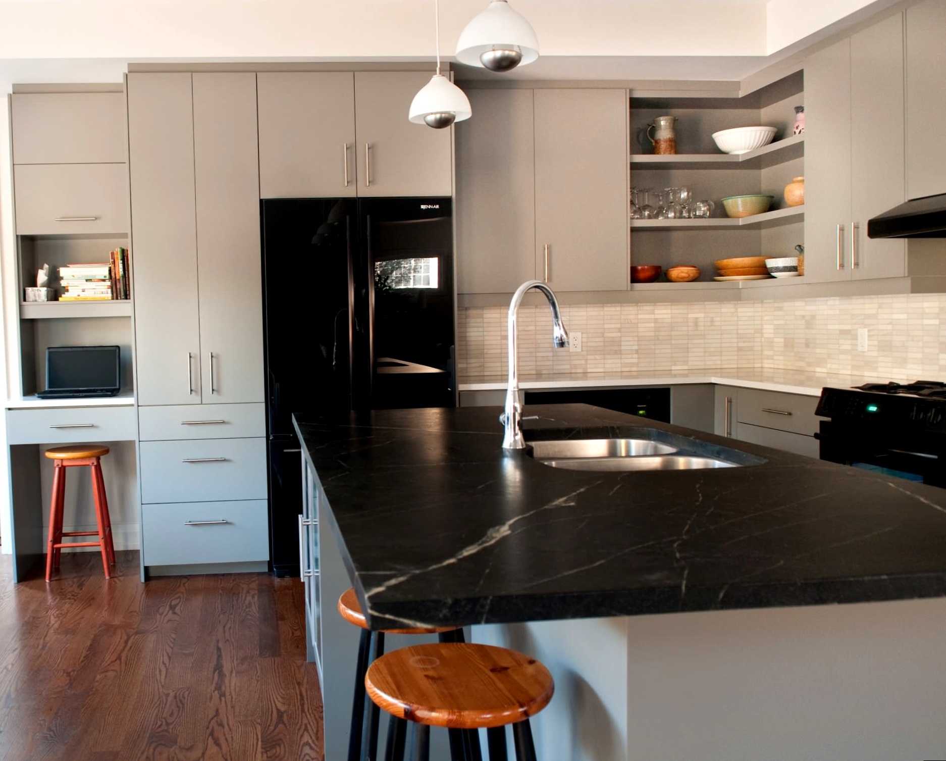 Mais quelques casiers à charnières sont encore mieux à prévoir pour le confort de l’hôtesse. L'ensemble de cuisine doit être lisse et monotone en ce qui concerne les formes géométriques claires.