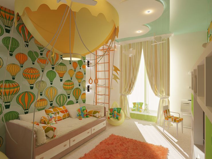 Pour l'aménagement de l'intérieur des chambres d'enfants dans des appartements modernes, utilisez des meubles plus clairs et moins encombrés. Il assume la simplicité des lignes et des formes, mais se distingue de l'intérieur des pièces pour adultes en ce qu'il a plus d'éléments décoratifs et d'accents clairs. Les murs peuvent être décorés avec des personnages de dessins animés modernes dans le cadre, mais il est préférable d'utiliser du papier peint uni. Les oreillers et les couvertures brillants définiront bien le style moderne.