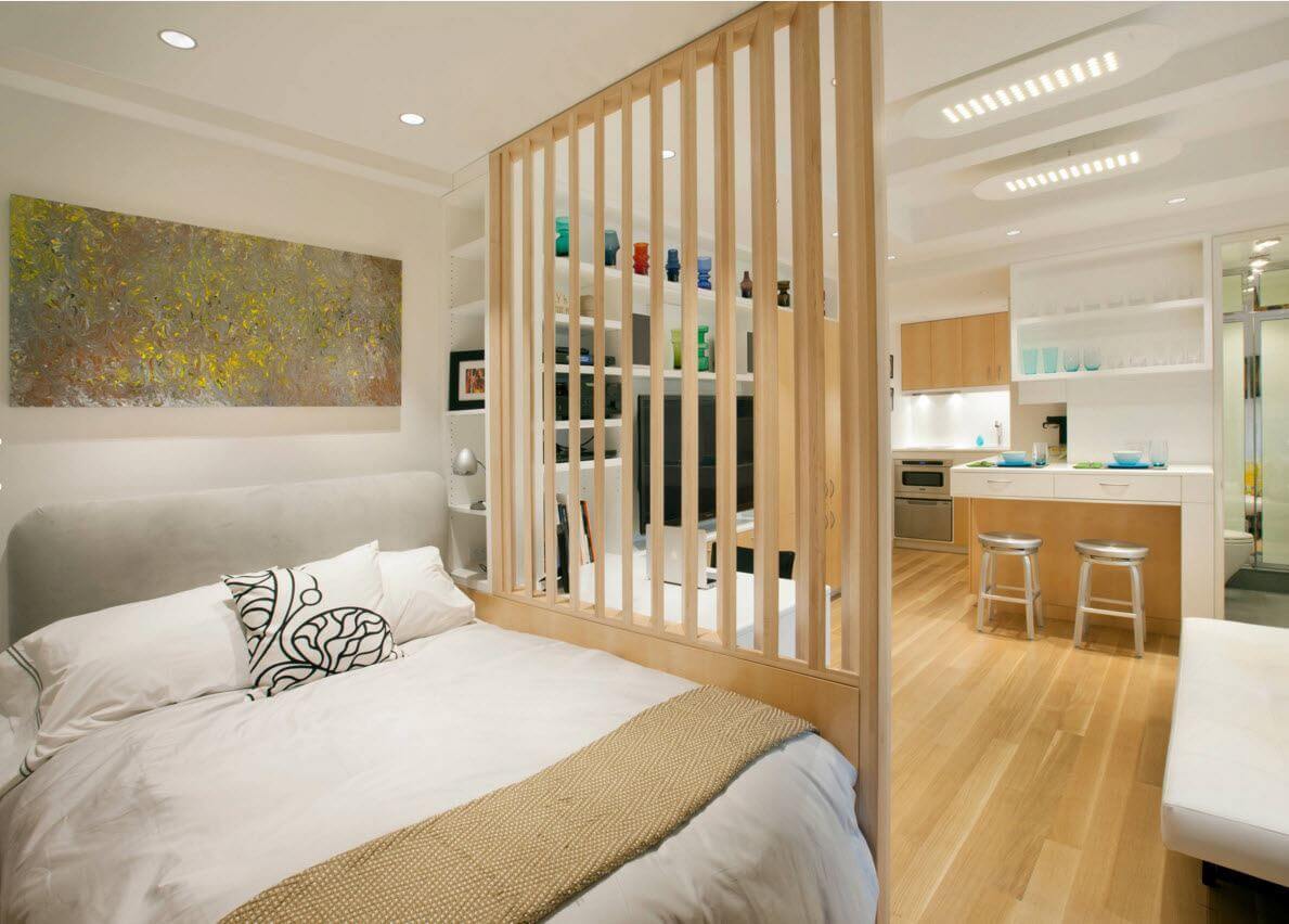 En ce qui concerne la disposition de la chambre ou du coin chambre dans un studio, cette pièce doit être très lumineuse et confortable. Il devrait être stérile, mais pas trop ennuyeux. Dans la chambre à coucher, vous devez disposer le lit de manière à laisser la place à d’autres éléments de l’intérieur.