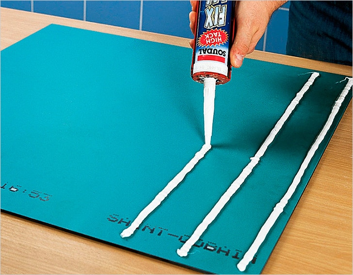 - Il est recommandé d'appliquer la colle en grosses gouttes à une distance de 5 cm les unes des autres. Il est également approprié d’appliquer des bandes à une distance de 8 à 12 cm, tout en évitant les collisions avec les bordures - le verre miroir chasse la substance, laissant des traces imprécises d’installation;