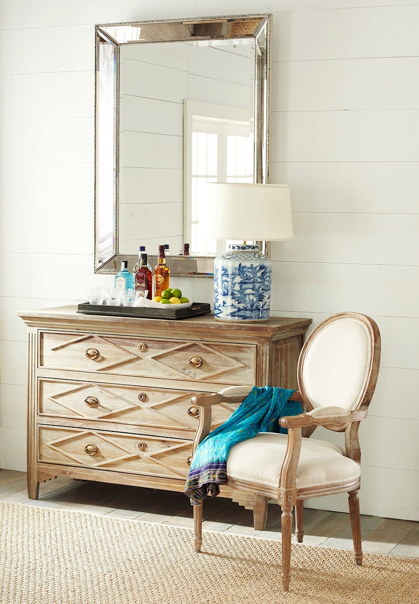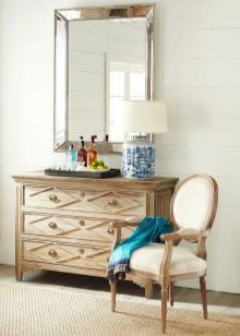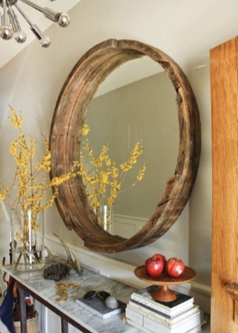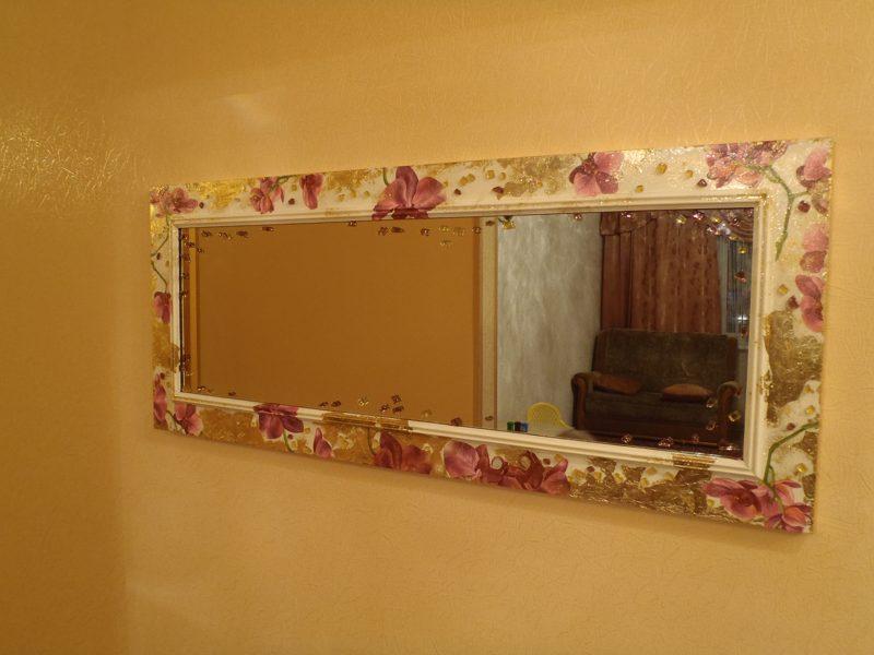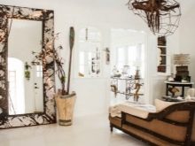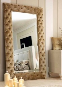 En 2017, un grand miroir est entré dans la mode. La vieille fenêtre ou même le cadre de la porte la décore parfaitement, ce qui en fait un exemple unique du style chebbi-chic ou provençal.Vous pouvez prendre des textiles (tissu, similicuir, toile de jute) et envelopper un petit cadre, en battant la texture ou l’impression du matériau. Même des sections de tuyaux en polyuréthane vous permettent de créer un élément inhabituel et original du décor. C'est un miroir intéressant, décoré de petits miroirs en forme de mosaïque ou de fleur.