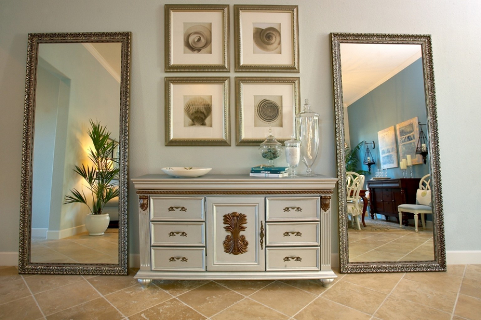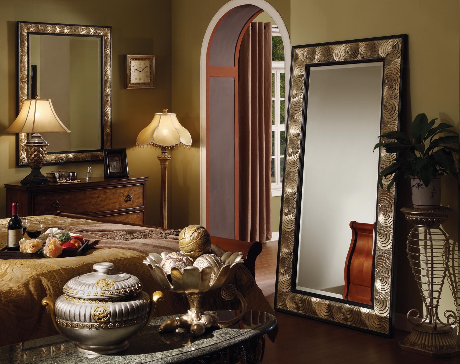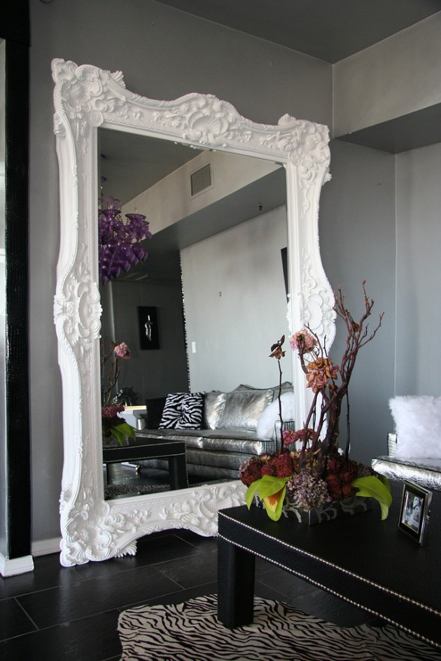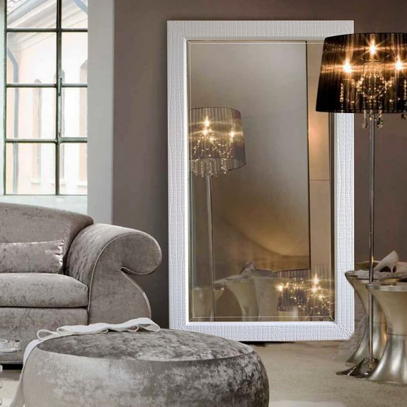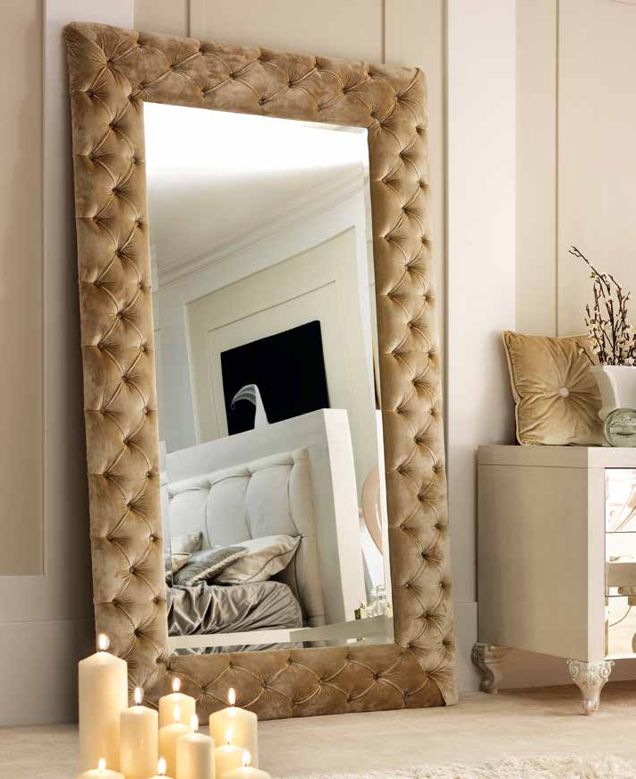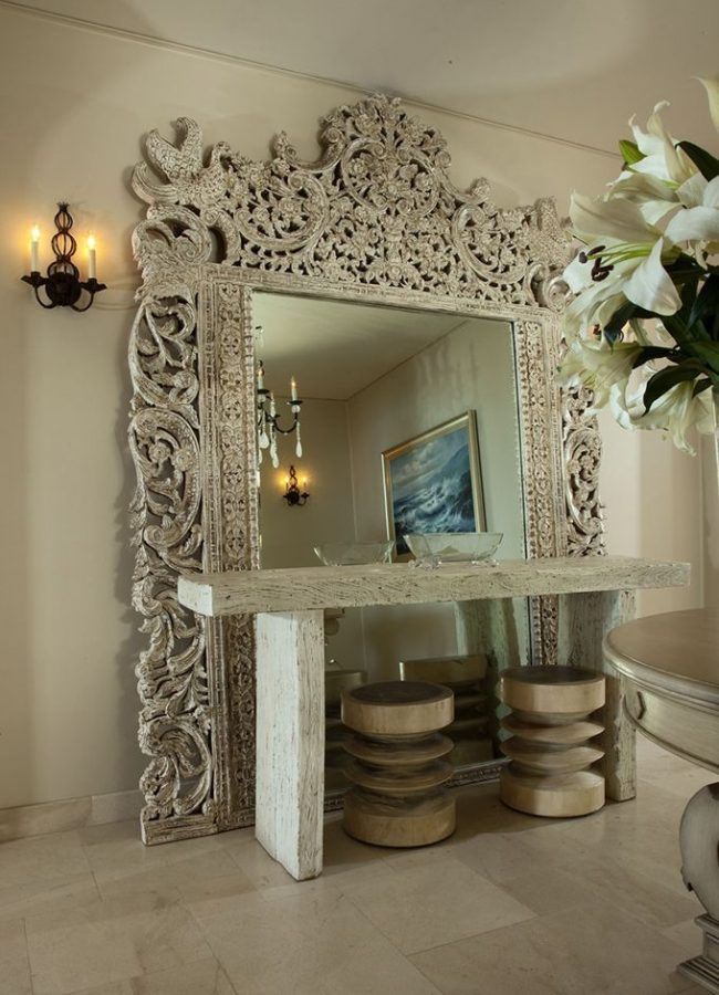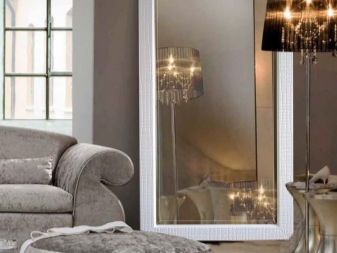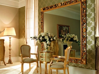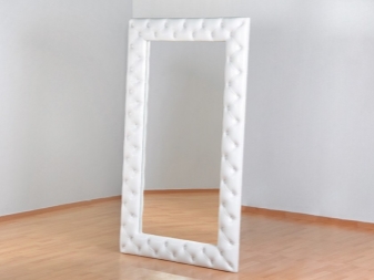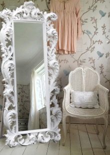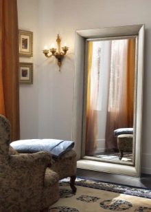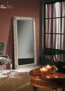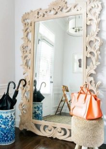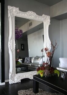 En décorant le miroir de sol, le cadre peut être fabriqué en moulage - socle de plafond, recouvert de peinture or ou argent, vieilli artificiellement avec du craquelure. Si vous avez des compétences, vous pouvez le décorer avec des éléments de stuc en plâtre.Le cadre du miroir, situé au sol, peut supporter de lourdes charges; il est donc possible de le décorer avec des détails plus volumineux.