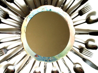 Les couverts en aluminium, qui ne sont plus utilisés depuis longtemps, peuvent devenir un cadre original pour un miroir de cuisine. Un fil de fer ou une feuille d'or transformera un simple miroir en un élément de décoration chic. Il est possible de décorer un miroir dans un cadre d'usine en MDF avec n'importe quoi, par exemple avec du stuc provenant d'un socle de plafond, en appliquant une peinture dorée, noire et blanche (vous pouvez ainsi créer un objet dans un style art déco non courbé et réel).