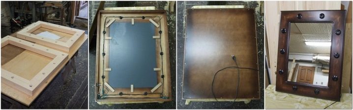 Détail obligatoire qui doit être soigneusement pensé - cadre de montage. Ceci est particulièrement important si le matériau utilisé pour la décoration était lourd et que la structure s’avérait massive. Pour que le miroir ne tombe pas soudainement du mur, la monture doit être fiable.Vous devrez peut-être utiliser un substrat supplémentaire. Assurez-vous d’avoir besoin de colle de haute qualité, par exemple sous le pistolet à colle, de clous liquides.
