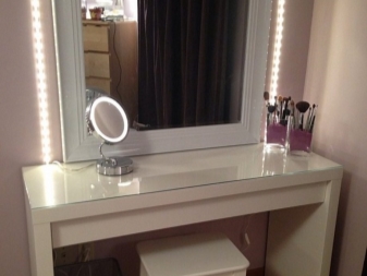 - En plein air Dans ces modèles, il existe plusieurs types de petites lampes. Ils équipent le miroir sous la forme d'un cadre à l'intérieur de la surface du miroir. Un produit cosmétique avec un tel rétro-éclairage peut être utilisé pour illuminer une pièce grâce à une lumière vive.