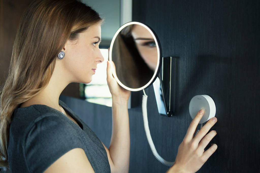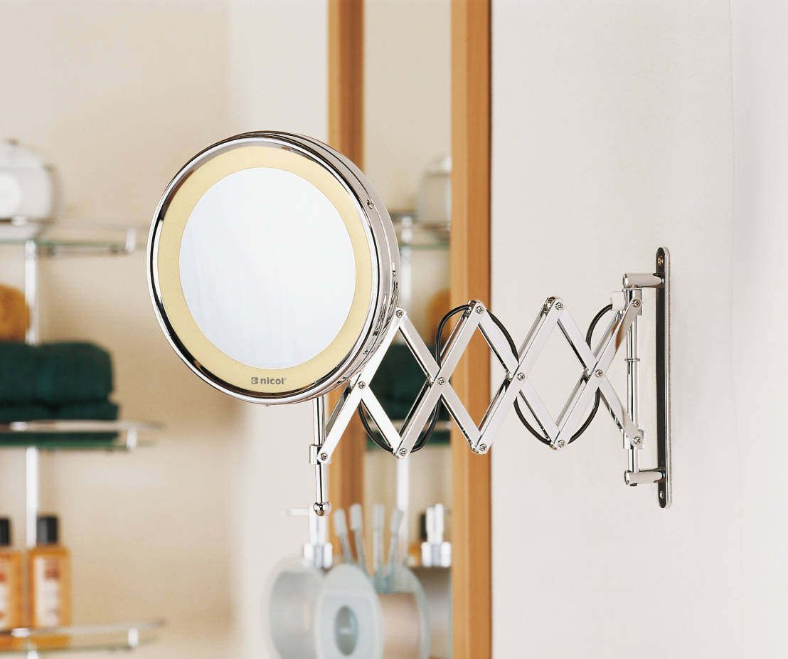 - Le miroir mural cosmétique est fixé au mur à l'aide d'un support articulé, grâce auquel le produit peut être tourné.