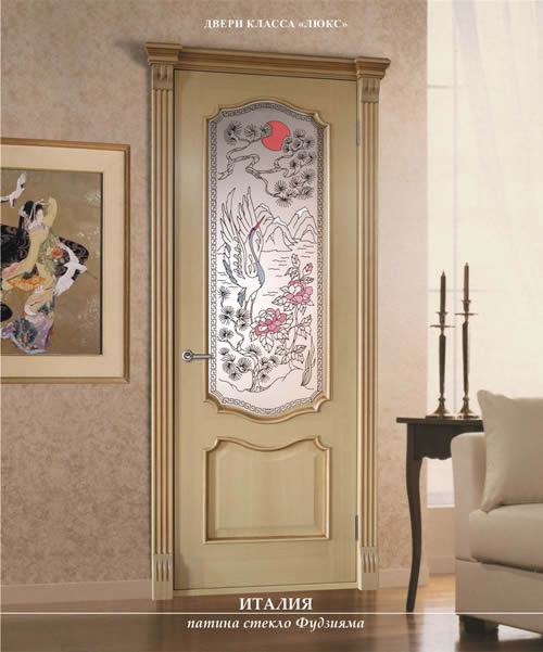 - "Italie". Le vantail de la porte présente une grande surface en verre, ornée d'une gravure au diamant. La surface non émaillée est plaquée avec une cerise, qui a un très beau motif de fibres de bois et une couleur naturelle agréable. Les colonnes sont utilisées comme décoration supplémentaire;