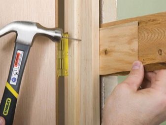 - Fixation de la porte. La boîte est fixée avec des cales en bois. Pour s'assurer que la porte est correctement positionnée, sa position est vérifiée au niveau du bâtiment. Les rails latéraux sont placés verticalement et le seuil et le cavalier supérieur horizontalement. Une fois que les marques sont définies sur l'ouverture, la boîte est retirée pour permettre le perçage de trous pour les fixations.