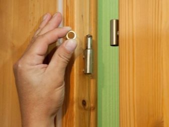 - Engrenages amovibles. L'installation de la porte sur de telles charnières est la plus simple. Pour ce faire, ils sont attachés au produit et à la boîte. Après cela, la toile est simplement mise sur des boucles sur les broches de support. Il est important de réaliser cette opération ensemble, qui contrôlera la direction de chaque élément séparément.