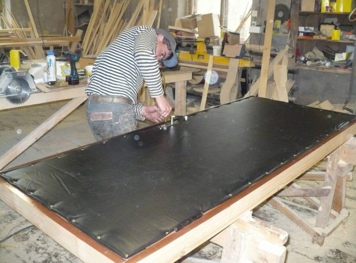 - Initialement, la porte est retirée des charnières et se trouve sur une surface horizontale. Il est conseillé d'utiliser plusieurs tabourets pour surélever la toile à une certaine hauteur. Il sera donc plus pratique de travailler avec lui.