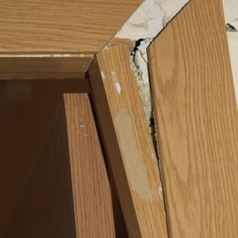 - Couper sur la longueur et la largeur de la préparation. Ils sont insérés dans la rainure et à cet endroit, ils sont soutenus par des dobori à plusieurs endroits de la boîte, par exemple des bicyclettes ou des morceaux de mousse congelée, de mousse plastique. Après cela, ils sont calés de sorte qu’il n’y ait pas de fissures et que Dobory se situe à 90 degrés par rapport au plan de la porte.