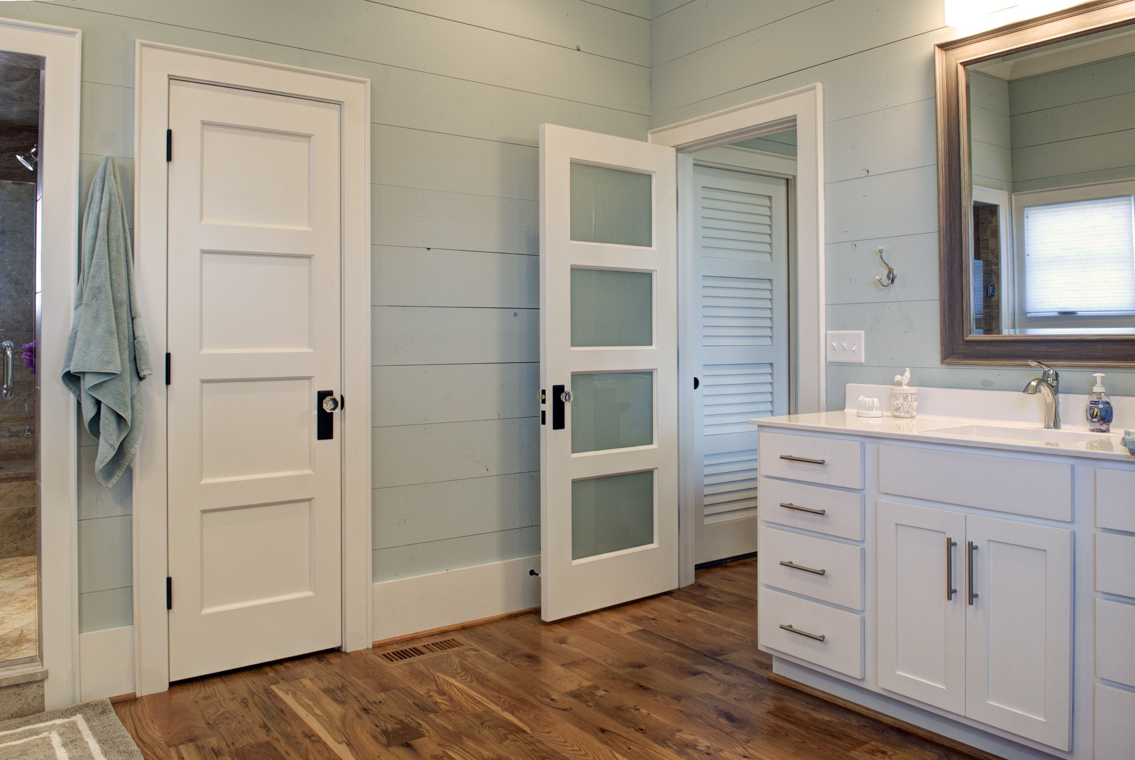 Les modèles de porte peuvent être encadrés ou en panneau. Le premier type est un modèle plutôt intéressant, caractérisé par une conception entièrement pliable. La deuxième version de la porte est constituée de toiles solides pouvant être complétées par divers éléments décoratifs. Il convient de noter que les portes en MDF de haute qualité résistent assez bien à l'humidité.