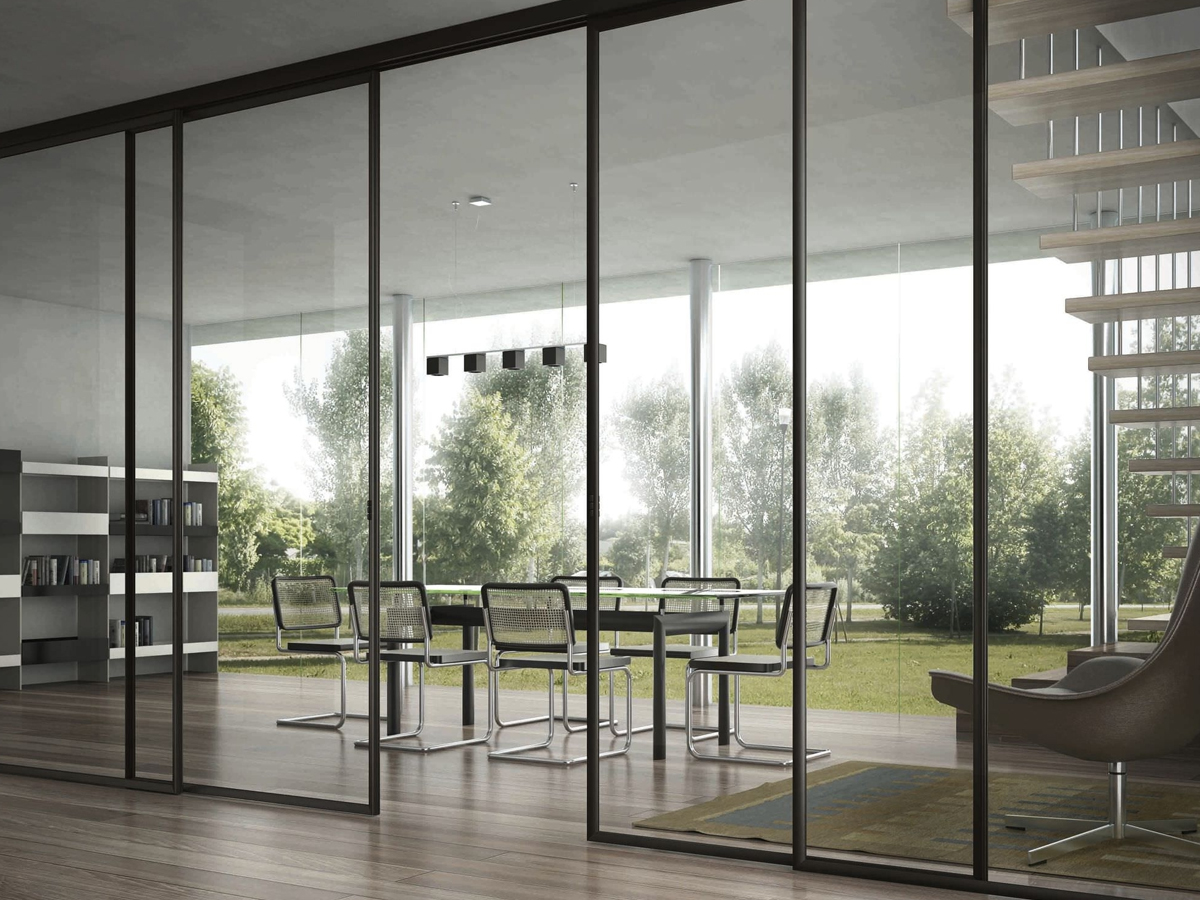 Les modèles en verre avec des bords en aluminium ont un effet positif sur l'espace visuel de la pièce. Ils semblent effacer la limite entre les pièces.. La solution idéale pour les petits espaces.