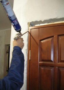 Dès que la mousse de montage sèche, il est nécessaire de procéder à la fixation des charnières et à l'installation du tissu lui-même. Tout est simple ici: les plaques des boucles sont fixées sur le butin et la fin du produit, puis elles sont assemblées. Vous pouvez fixer la porte vous-même en soulevant le produit et en le plaçant sur les charnières à un angle de 45 °.