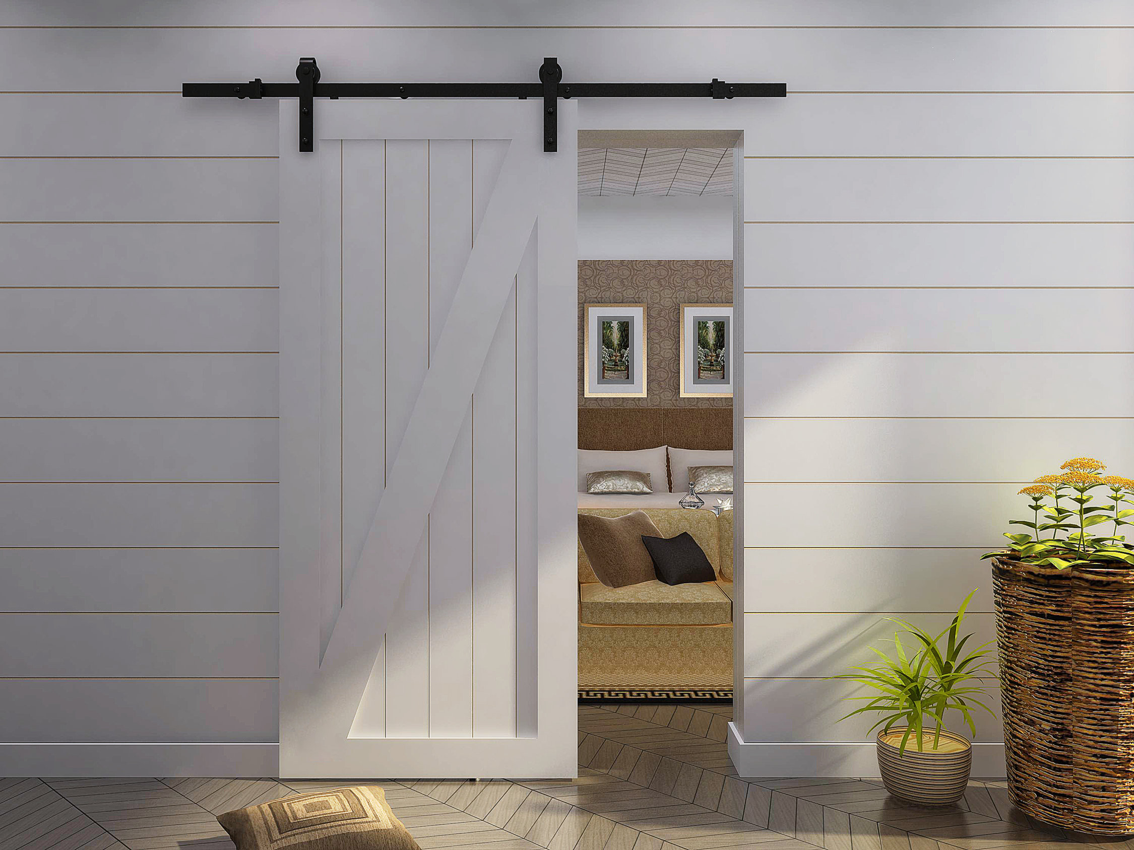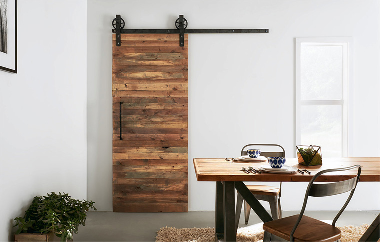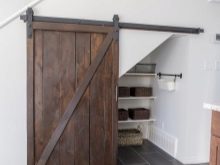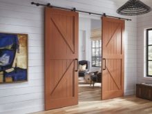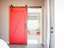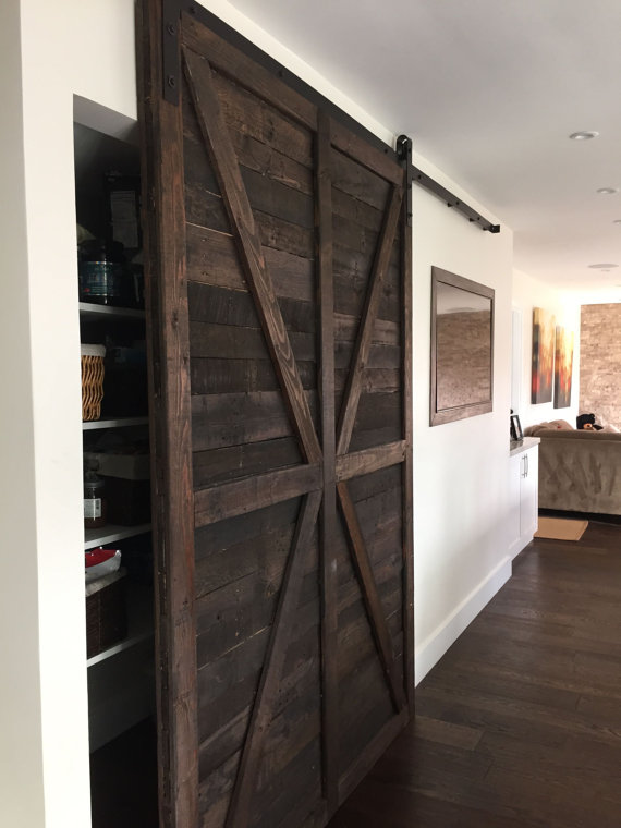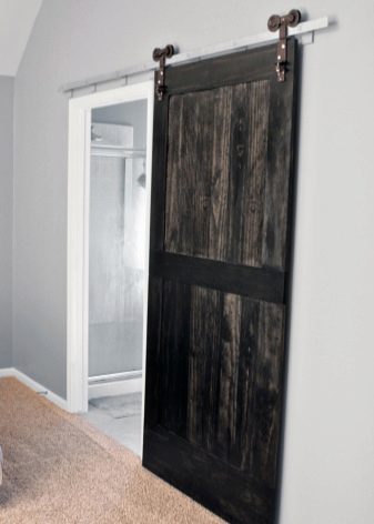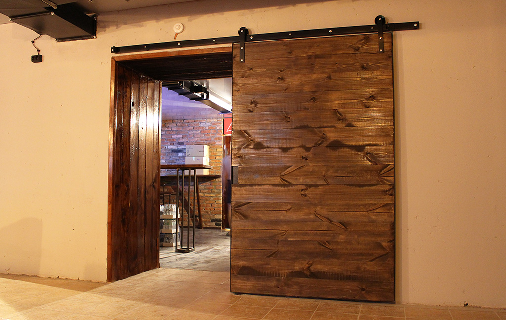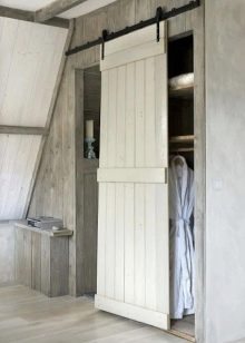 Porte de la grange est une structure mobile sur le rail. Le support métallique à rouleaux vous permet de déplacer une feuille de bois le long du mur. La taille de ces produits dépend des dimensions de la pièce et de la largeur de la porte.