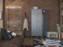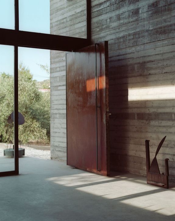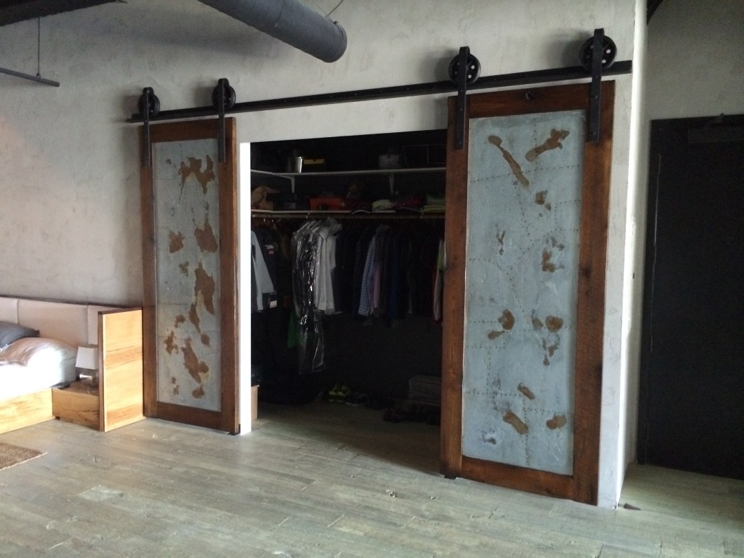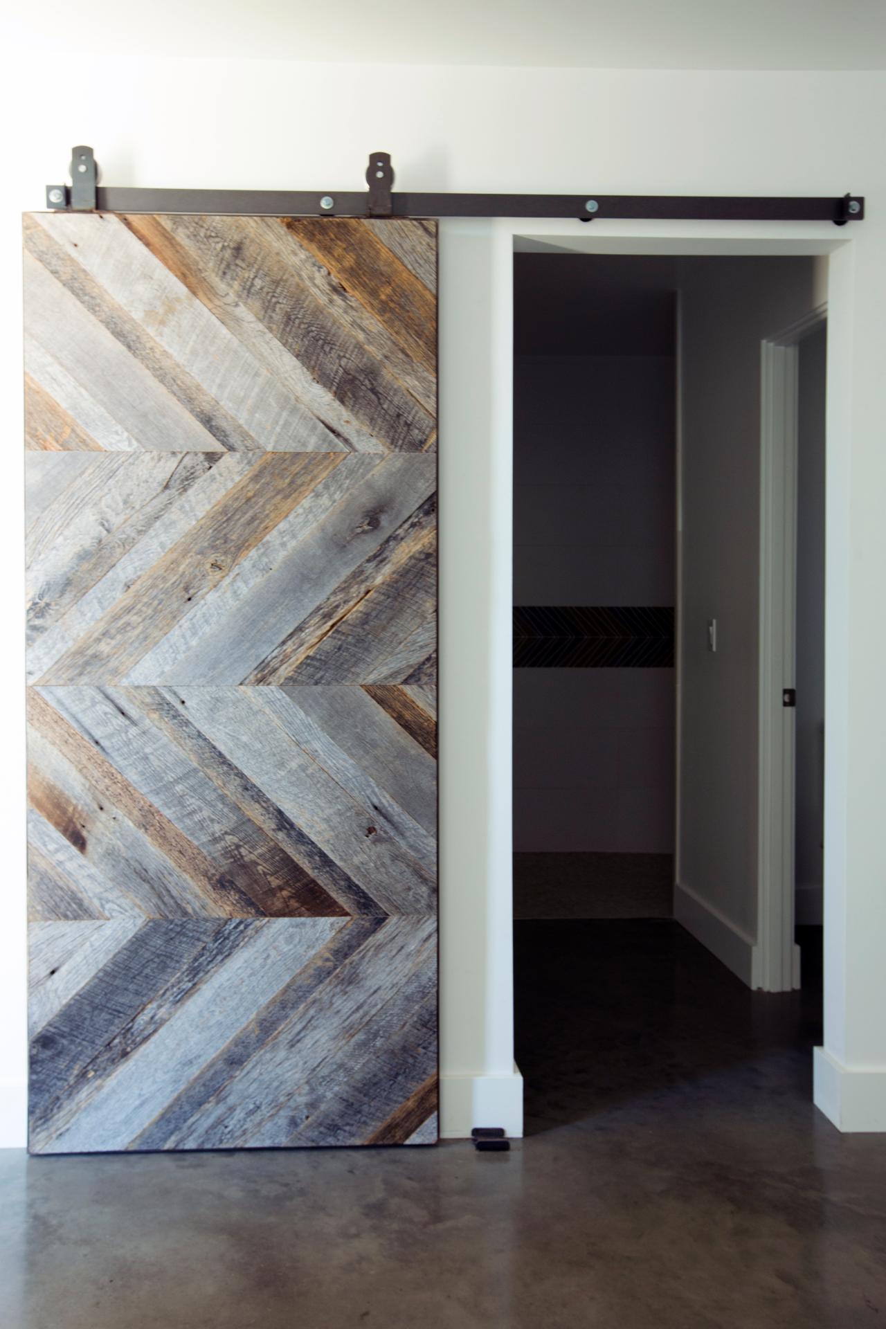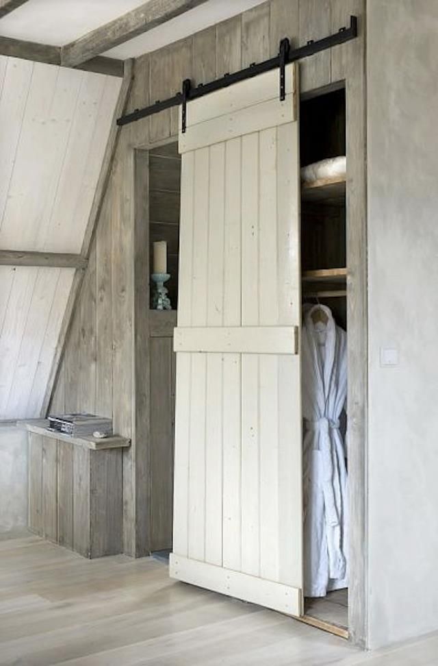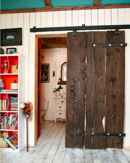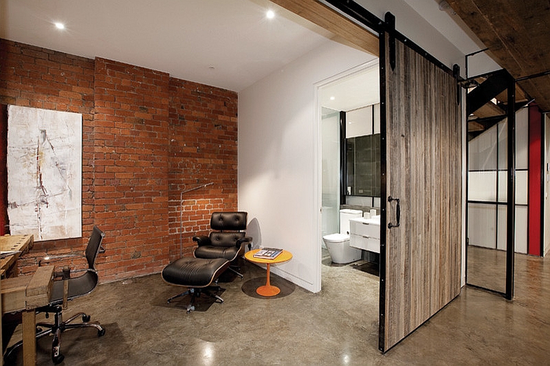Une large porte coulissante en tôle semble très inhabituelle à l’intérieur de la pièce et lui donne l’apparence d’un lieu de stockage.