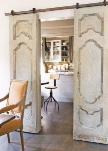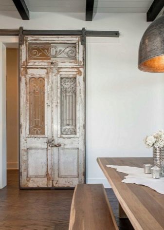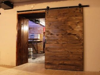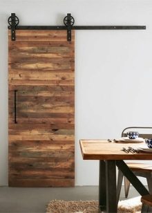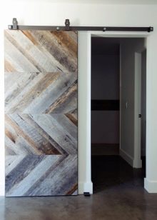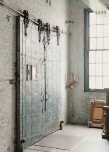 Coulissante Les constructions industrielles sont généralement des planches collées larges sans motifs décoratifs ni revêtements brillants. Installé une telle porte à l'intérieur ou le long du mur. Pour la fabrication, utilisez des matériaux tels que le bois, le verre ou le métal.